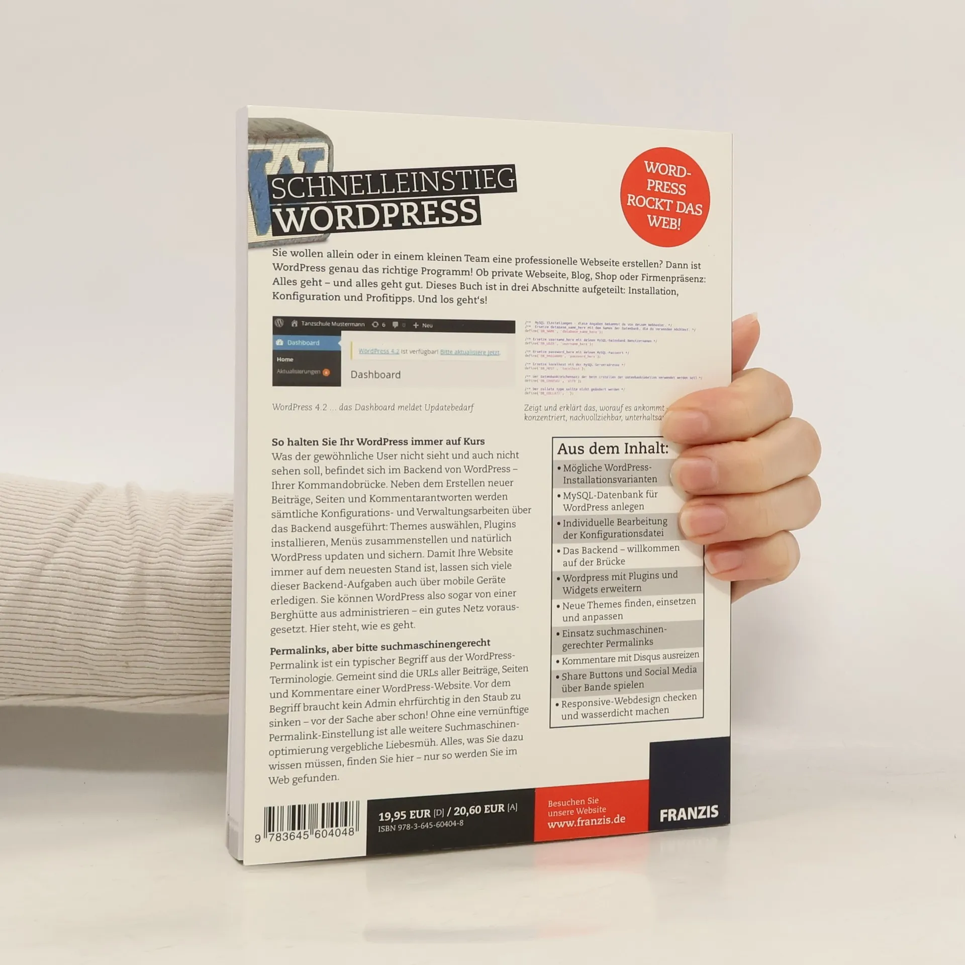 Möchten Sie eine professionelle Webseite allein oder im kleinen Team erstellen? WordPress ist die ideale Lösung! Egal, ob für eine private Seite, einen Blog, einen Shop oder eine Firmenpräsenz – alles ist möglich und funktioniert gut. Das Buch gliedert sich in drei Abschnitte: Installation, Konfiguration und Profitipps. Es zeigt klar und unterhaltsam, wie Sie Ihr WordPress auf Kurs halten. Das Backend von WordPress, Ihre Kommandobrücke, ermöglicht es Ihnen, Beiträge, Seiten und Kommentare zu verwalten sowie Themes auszuwählen, Plugins zu installieren und Menüs zu gestalten. Viele dieser Aufgaben können sogar mobil erledigt werden, sodass Sie WordPress von nahezu überall administrieren können. Ein wichtiger Aspekt sind die Permalinks, die URLs Ihrer Inhalte. Eine korrekte Permalink-Einstellung ist entscheidend für die Suchmaschinenoptimierung. Das Buch bietet Ihnen alle nötigen Informationen, um im Web gefunden zu werden. Sie erfahren, wie Sie WordPress installieren, eine MySQL-Datenbank anlegen und die Konfigurationsdatei anpassen. Zudem werden Möglichkeiten zur Erweiterung mit Plugins und Widgets, die Suche nach neuen Themes, die Nutzung suchmaschinengerechter Permalinks und die Integration von Kommentarsystemen und Social Media behandelt. Responsive Webdesign wird ebenfalls thematisiert, um Ihre Webseite optimal darzustellen.