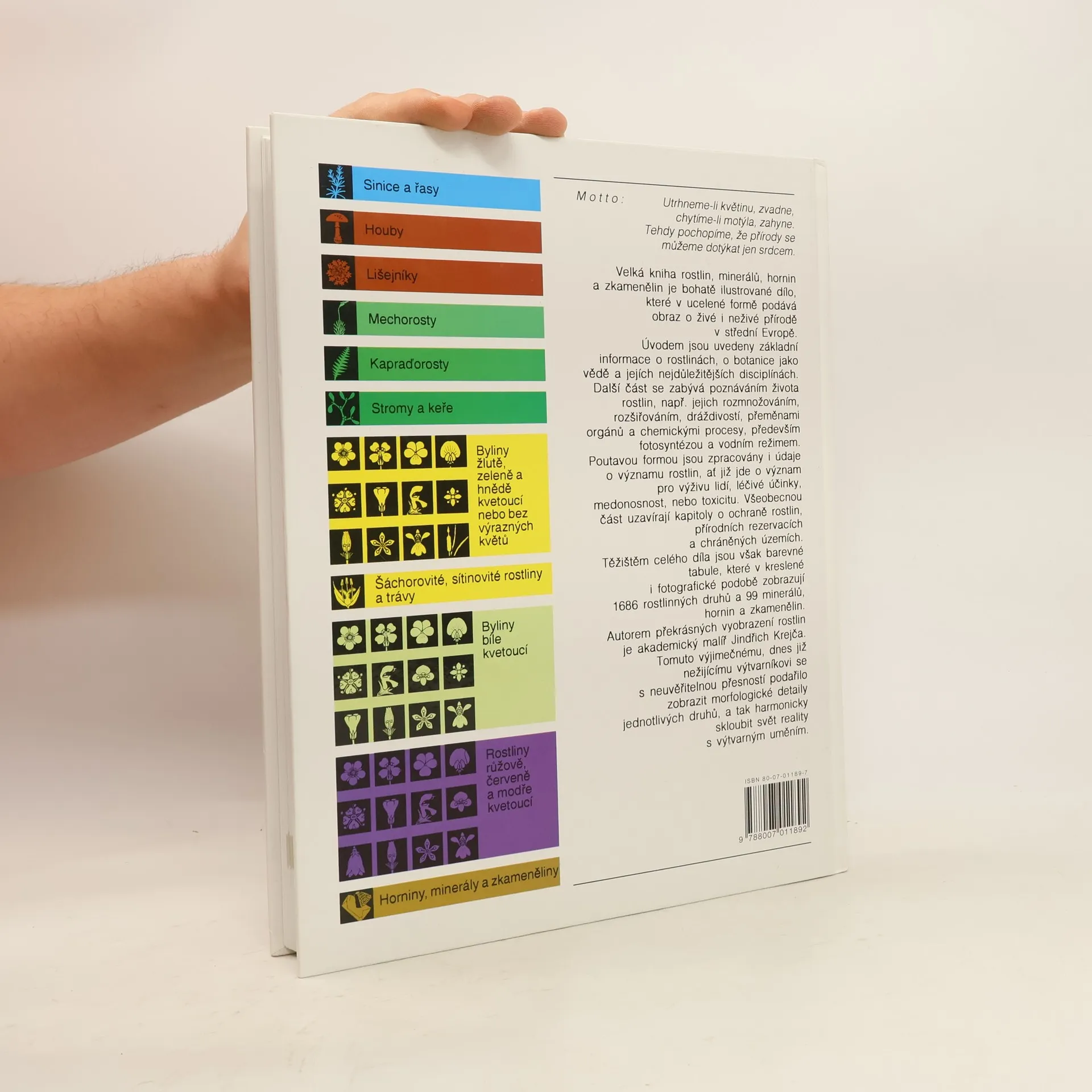 Velká kniha rostlin, minerálů, hornin a zkamenělin je bohatě ilustrované dílo, které v ucelené formě podává obraz o živé i neživé přírodě ve střední Evropě. Úvodem jsou uvedeny základní informace o rostlinách, o botanice jako vědě a jejích nejdůležitějších disciplínách. Další část se zabývá poznáváním života rostlin, např. jejich rozmnožováním, rozšiřováním, dráždivostí, přeměnami orgánů a chemickými procesy, především fotosyntézou a vodním režimem. Poutavou formou jsou zpracovány i údaje o významu rostlin, ať již jde o význam pro výživu lidí, léčivé účinky, medonosnost, nebo toxicitu. Všeobecnou část uzavírají kapitoly o ochraně rostlin, přírodních rezervacích a chráněných územích. Těžištěm celého díla jsou však barevné tabule, které v kreslené i fotografické podobě zobrazují 1686 rostlinných druhů a 99 minerálů, hornin a zkamenělin. Autorem překrásných vyobrazení rostlin je akademický malíř Jindřich Krejča. Tomuto výjimečnému, dnes již nežijícímu výtvarníkovi se s neuvěřitelnou přesností podařilo zobrazit morfologické detaily jednotlivých druhů, a tak harmonicky skloubit svět reality s výtvarným uměním.