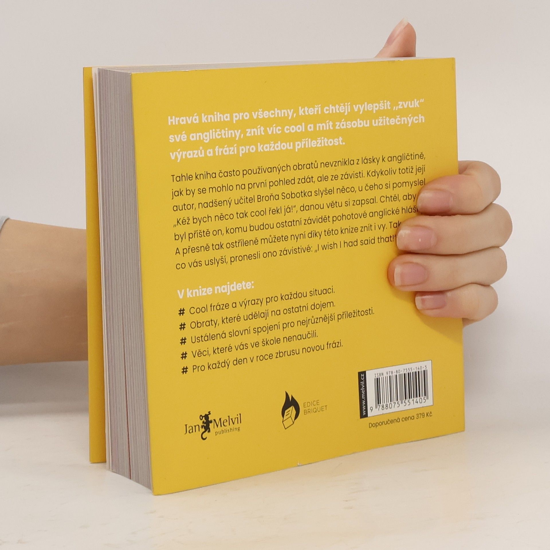 I wish I had said that! — Kéž bych to byl řekl! … takhle znělo jediné kritérium pro výběr 365 cool anglických frází a výrazů, které v této knize najdete. Broňa, nadšený učitel angličtiny z Brna, autor titulu Zamilujte se do angličtiny, přidává do svého knižního portfolia neodolatelný doplněk pro každého uživatele tohoto jazyka. Téměř rok vybíral se svým kamarádem, studujícím toho času v USA, často užívané fráze, idiomy či ustálená rčení, jejichž význam byste s pouhou znalostí jednotlivých slovíček nerozklíčovali. Výsledkem je jedna cool fráze pro každý den v roce, takže až za 365 dní pohlédnete na svůj pokrok, tak budete i díky připojené online cvičebnici v užívání i porozumění angličtiny o 365 frází protřelejší. Knihou vás doprovodí zábavné grafické zpracování Martiny Lagové, postavička malého Broni a ukázkové užití dané fráze.