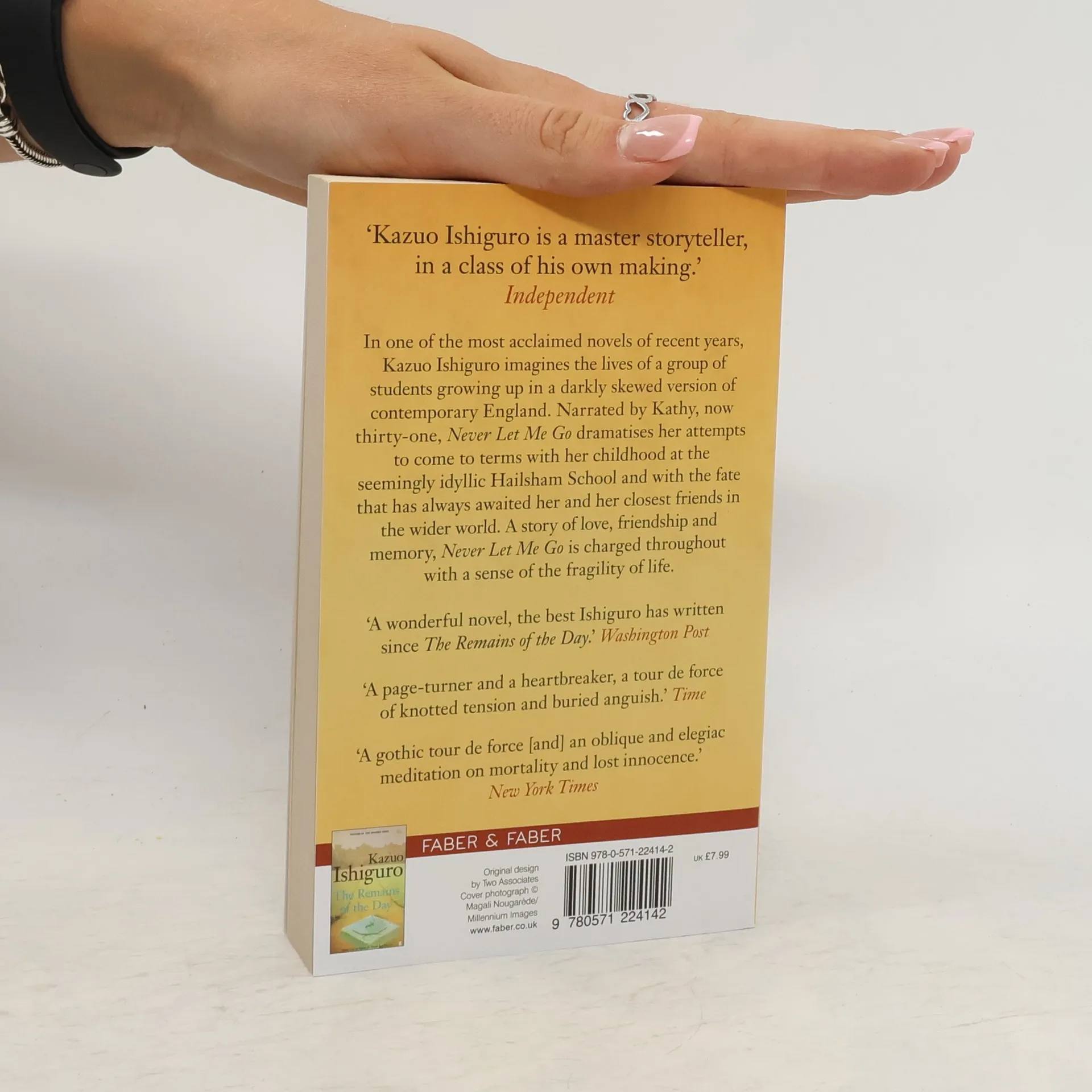 of a group of students growing up in a darkly skewered version of contemporary England. Narrated by Kathy, now 31, Never Let Me Go hauntingly dramatises her attempts to come to terms with her childhood at the seemingly idyllic Hailsham School, and with the fate that has always awaited her and her closest friends in the wider world. A story of love, friendship and memory, Never Let Me Go is charged throughout with a sense of the fragility of life.If you enjoyed Never Let Me Go, you might also like Ishiguro's The Remains of the Day, now available in Faber Modern Classics.