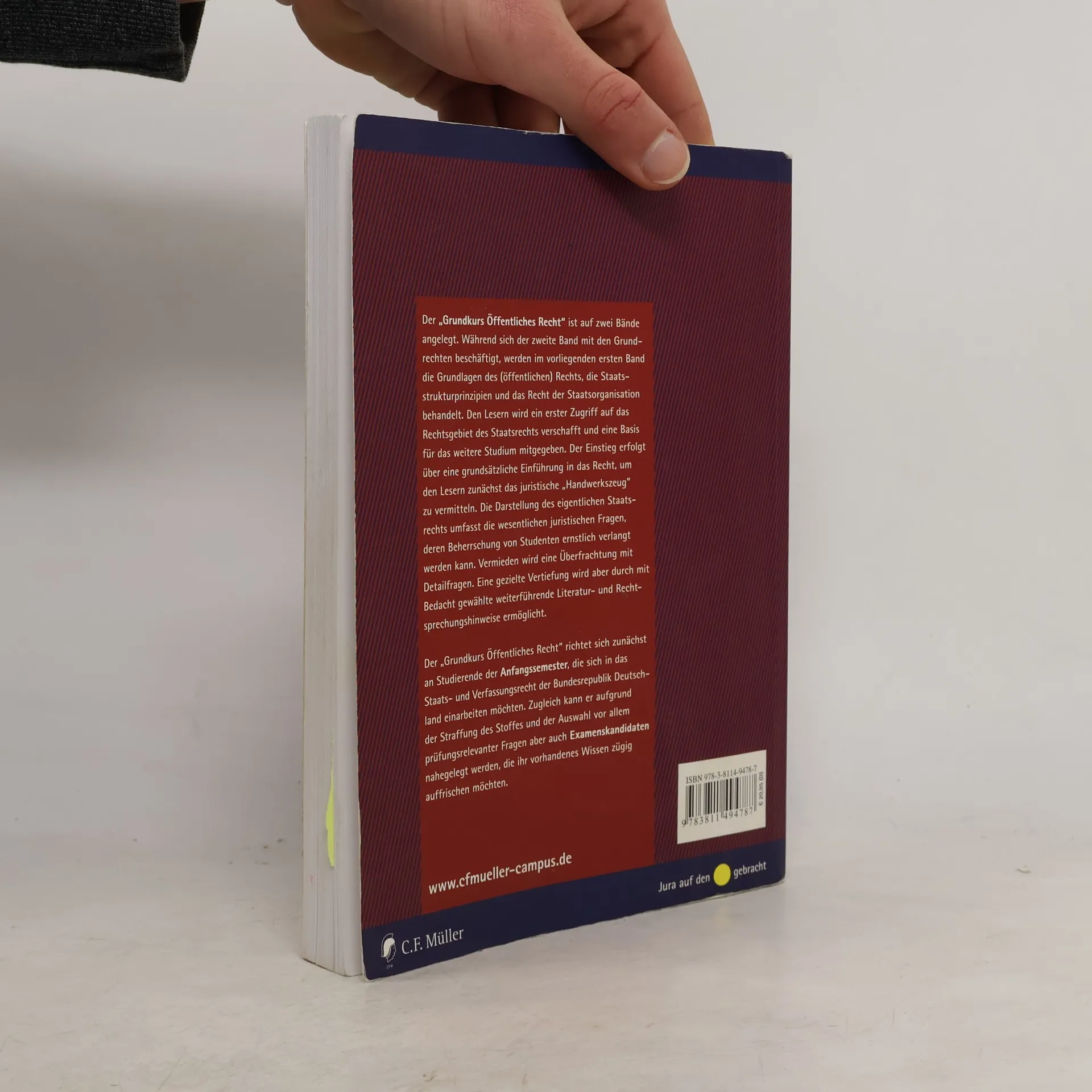 Der "Grundkurs Öffentliches Recht" ist auf zwei Bände angelegt. Während sich der zweite Band mit den Grundrechten beschäftigt, werden im vorliegenden ersten Band die Grundlagen des (öffentlichen) Rechts, die Staatsstrukturprinzipien und das Recht der Staatsorganisation behandelt. Den Lesern wird ein erster Zugriff auf das Rechtsgebiet des Staatsrechts verschafft und eine Grundlage für das weitere Studium mitgegeben. Der Einstieg erfolgt über eine grundsätzliche Einführung in das Recht, um den Lesern zunächst das juristische "Handwerkszeug" zu vermitteln. Die Darstellung des eigentlichen Staatsrechts beschränkt sich auf die wesentlichen juristischen Fragen, deren Beherrschung von Studenten ernstlich verlangt werden kann. Der "Grundkurs Öffentliches Recht" richtet sich zunächst an Studierende der Anfangssemester, die sich in das Staats- und Verfassungsrecht der Bundesrepublik Deutschland einarbeiten möchten. Zugleich kann er aufgrund der Straffung des Stoffes und der Auswahl vor allem prüfungsrelevanter Fragen aber auch Examenskandidaten nahegelegt werden, die ihr vorhandenes Wissen zügig auffrischen möchten.