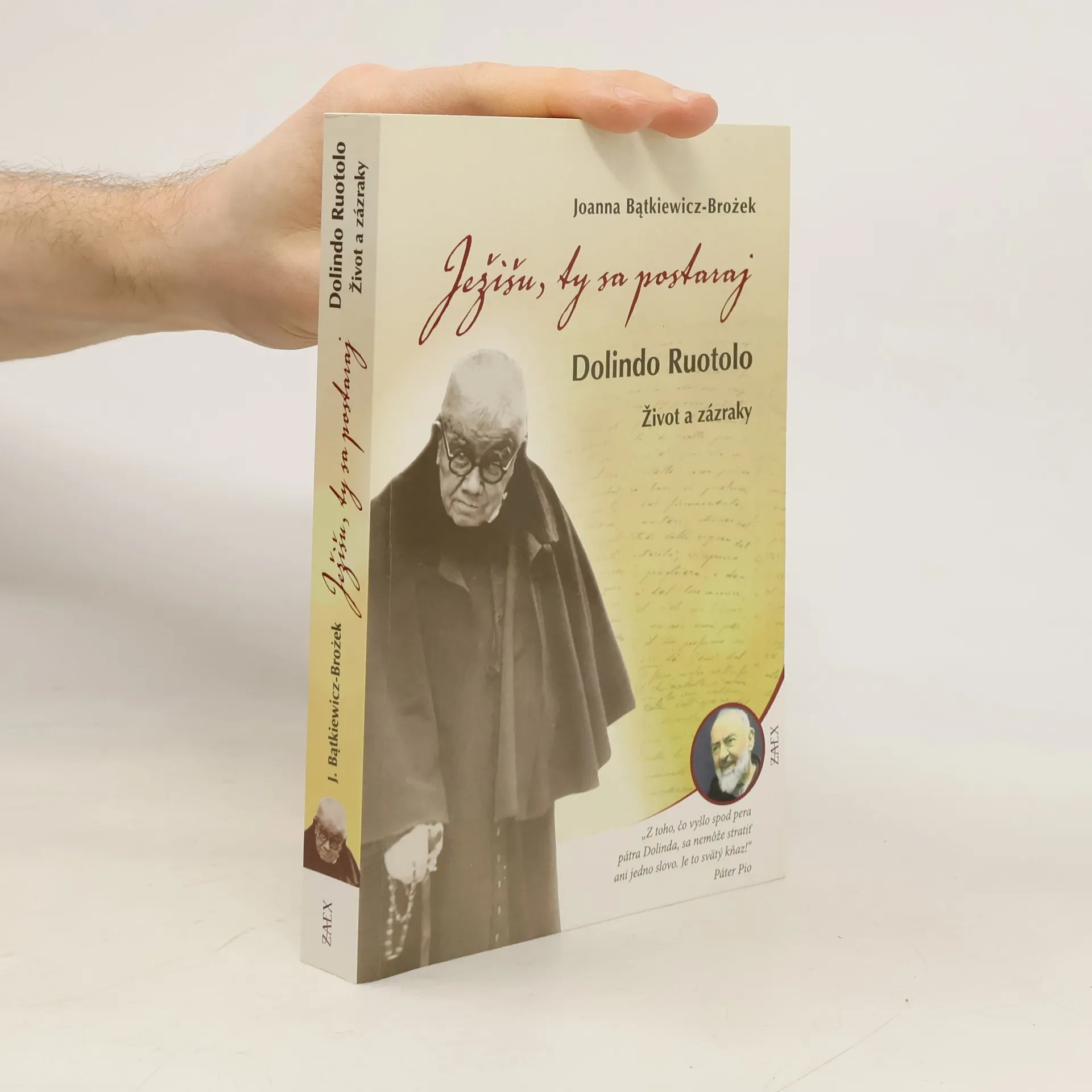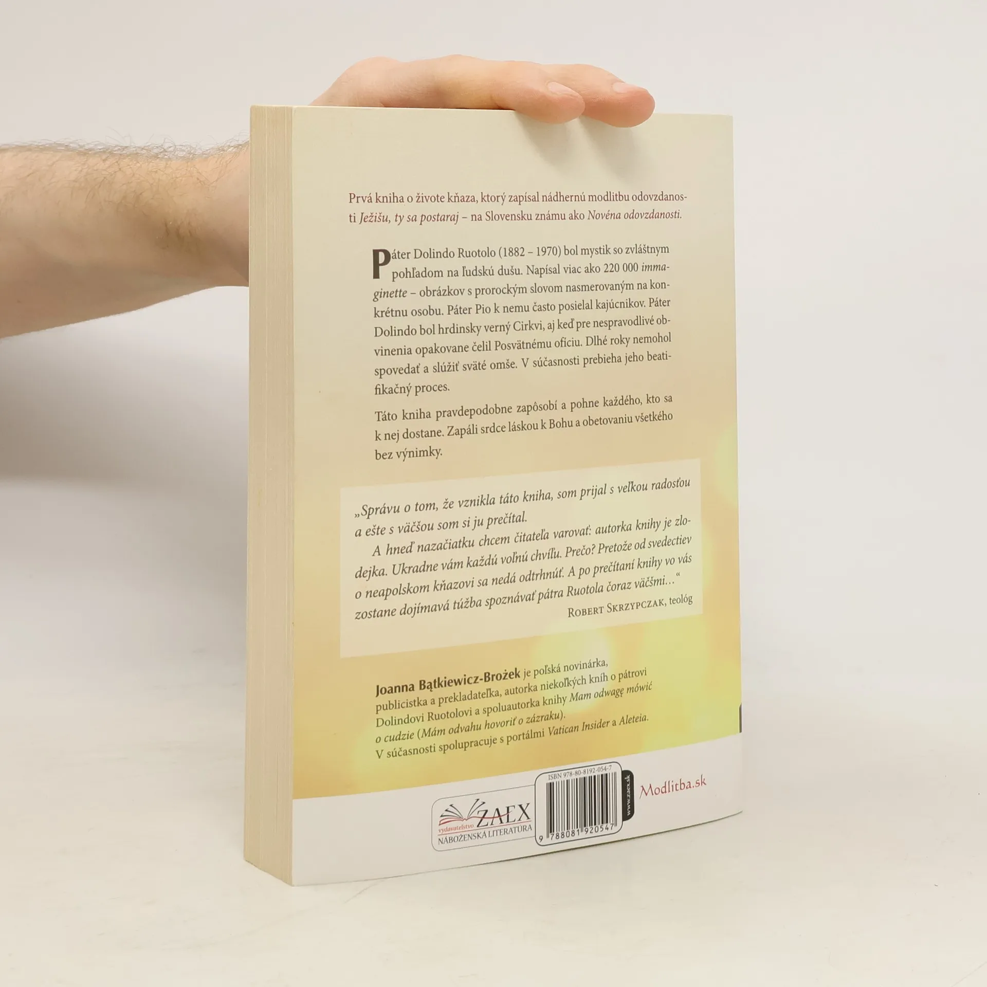 Prvá kniha o živote kňaza, ktorý zapísal nádhernú modlitbu odovzdanosti Ježišu, ty sa postaraj na Slovensku známu ako Novéna odovzdanosti.Z toho, čo vyšlo spod pera pátra Dolinda, sa nemôže stratiť ani jedno slovo. Je to svätý kňaz! - Páter Pio.Páter Dolindo Ruotolo (1882 1970) bol mystik so zvláštnym pohľadom na ľudskú dušu. Napísal viac ako 220 000 immaginette obrázkov s prorockým slovom nasmerovaným na konkrétnu osobu. Páter Pio k nemu často posielal kajúcnikov. Páter Dolindo bol hrdinsky verný Cirkvi, aj keď pre nespravodlivé obvinenia opakovane čelil Posvätnému ofíciu. Dlhé roky nemohol spovedať a slúžiť sväté omše. V súčasnosti prebieha jeho beatifikačný proces.Táto kniha pravdepodobne zapôsobí a pohne každého, kto sa k nej dostane. Zapáli srdce láskou k Bohu a obetovaniu všetkého bez výnimky.Joanna Bątkiewiczová-Brożeková je poľská novinárka, publicistka a prekladateľka, autorka niekoľkých kníh o pátrovi Dolindovi Ruotolovi a spoluautorka knihy Mam odwagę mówić o cudzie (Mám odvahu hovoriť o zázraku). V súčasnosti spolupracuje s portálmi Vatican Insider a Aleteia.