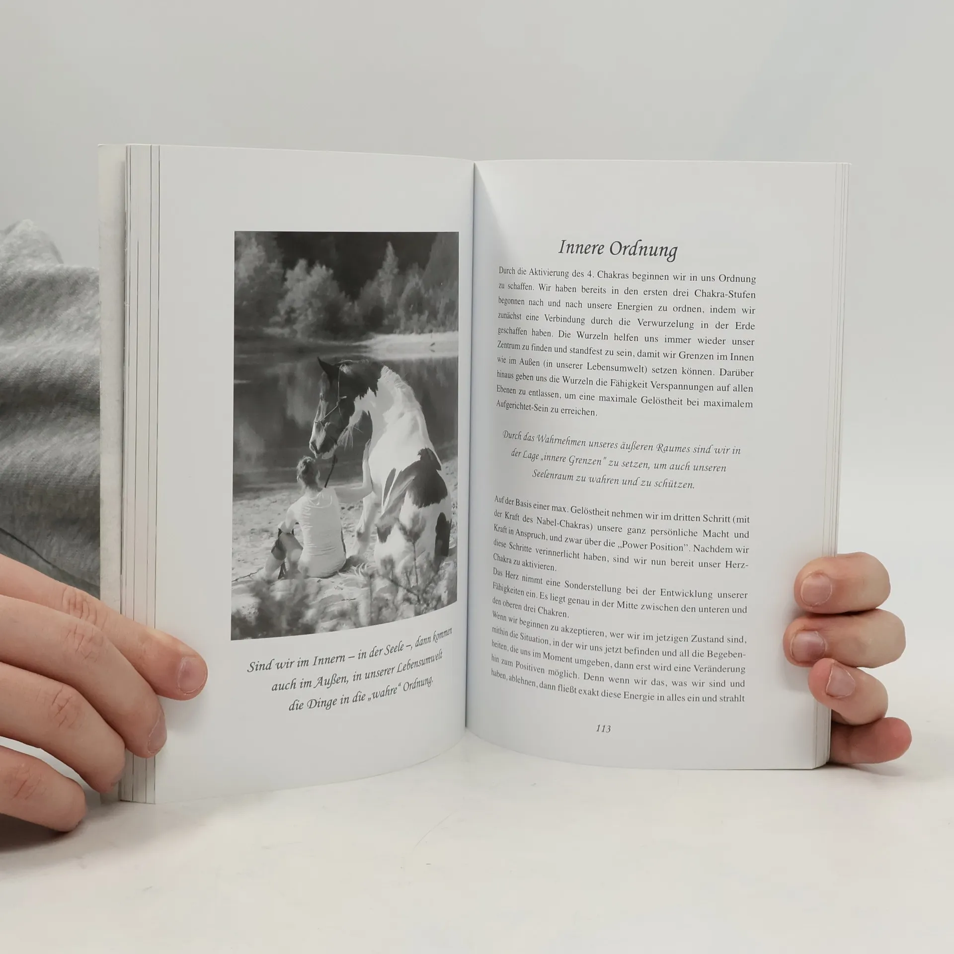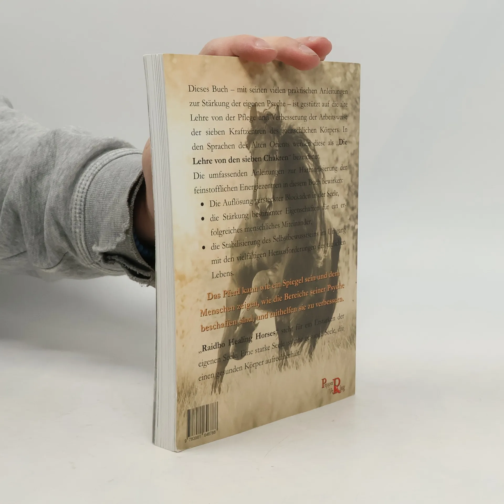 Dieses Buch – mit seinen vielen praktischen Anleitungen zur Stärkung der eigenen Psyche – ist gestützt auf die alte Lehre von der Pflege und Verbesserung der Arbeitsweise der sieben Kraftzentren des menschlichen Körpers. In den Sprachen des Alten Orients werden diese als „Die Lehre von den sieben Chakren“ bezeichnet. Die umfassenden Anleitungen zur Harmonisierung der feinstofflichen Energiezentren in diesem Buch bewirken: Die Auflösung versteckter Blockaden in der Seele, die Stärkung bestimmter Eigenschaften für ein erfolgreiches menschliches Miteinander, die Stabilisierung des Selbstbewusstseins im Umgang mit den vielfältigen Herausforderungen des täglichen Lebens. Das Pferd kann wie ein Spiegel sein und dem Menschen zeigen, wie die Bereiche seiner Psyche beschaffen sind, und mithelfen sie zu verbessern. „Raidho Healing Horses“ steht für ein Erstarken der eigenen Seele. Eine starke Seele ist eine gesunde Seele, die einen gesunden Körper aufrechterhält.