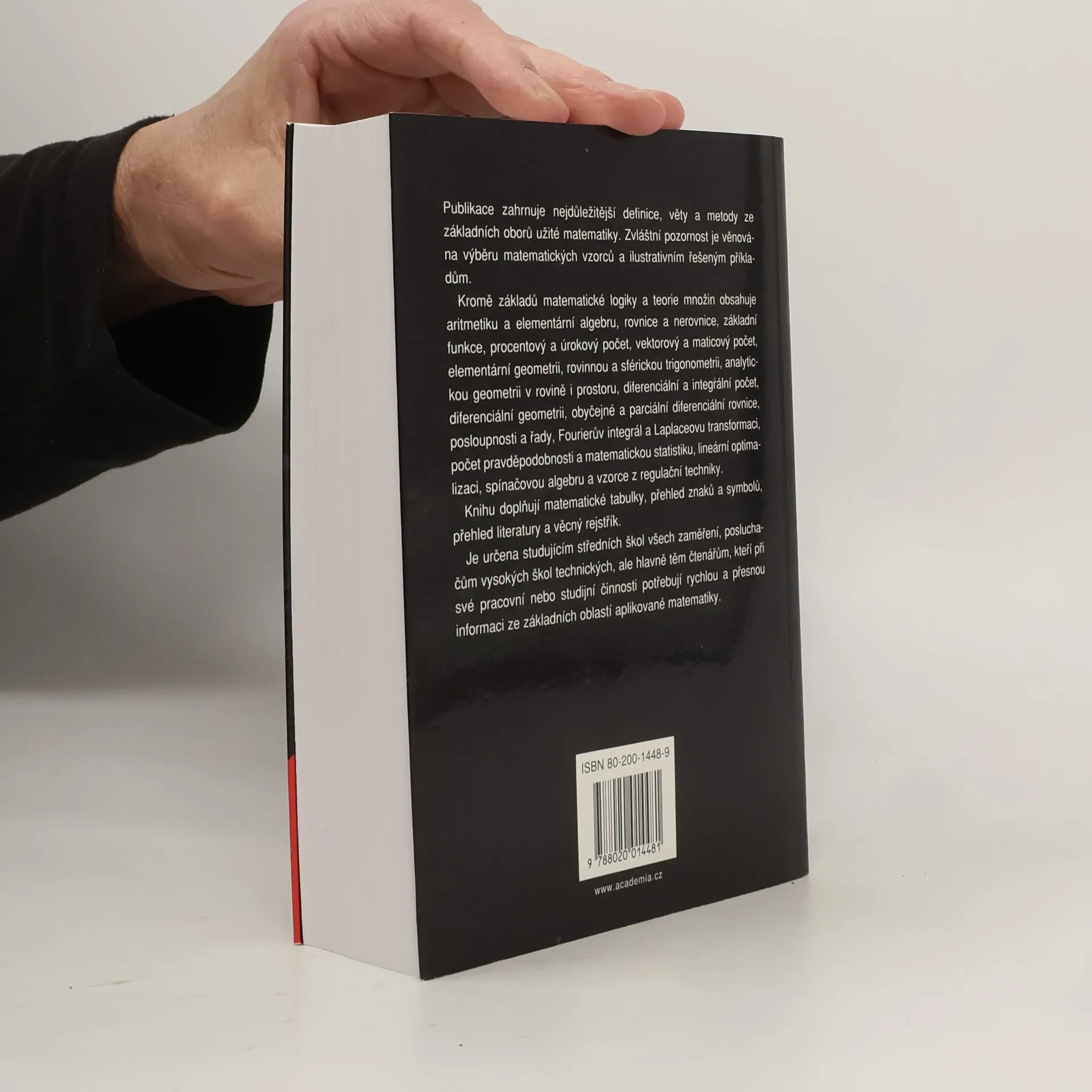 Publikace zahrnuje nejdůležitější definice, věty a metody ze základních oborů užité matematiky. Zvláštní pozornost je věnována výběru matematických vzorců a ilustrativním řešeným příkladům. Kromě základů matematické logiky a teorie množin obsahuje aritmetiku a elementární algebru, rovnice a nerovnice, základní funkce, procentový a úrokový počet, vektorový a maticový počet, elementární geometrii, rovinnou a sférickou trigonometrii, analytickou geometrii v rovině a prostoru, diferenciální a integrální počet, diferenciální geometrii, obyčejné a parciální diferenciální rovnice, posloupnosti a řady, Fourierův integrál a Laplaceovu transformaci, počet pravděpodobnosti a matematickou statistiku, lineární optimalizaci, spínačovou algebru a vzorce z regulační techniky. Knihu doplňují matematické tabulky, přehled znaků a symbolů, přehled literatury a věcný rejstřík. Je určena studujícím středních škol všech zaměření, posluchačům vysokých škol technických, ale hlavně těm čtenářům, kteří při své pracovní nebo studijní činnosti potřebují rychlou a přesnou informaci ze základní oblasti aplikované matematiky.