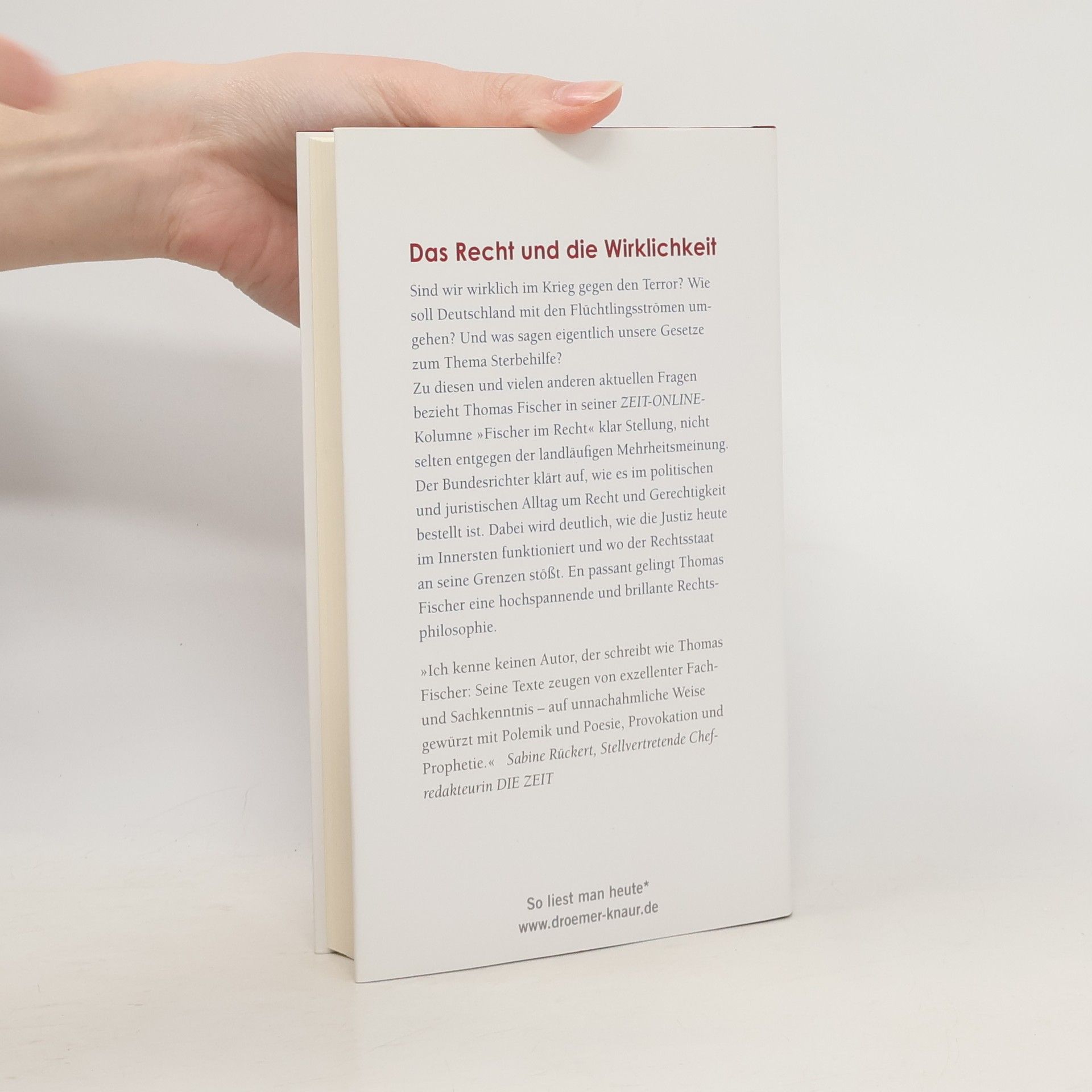 Das Recht und die Wirklichkeit Ist Deutschland ein gerechtes Land? Kommt darauf an. Zumindest ein rechtsstaatliches? Weitgehend. Wie es aber im politischen und juristischen Alltag um Recht und Gesetz bestellt ist und wie die Justiz in Deutschland funktioniert, darüber klärt Thomas Fischer auf. Der Bundesrichter mischt sich ein in die aktuellen Debatten: Sind wir wirklich im Krieg gegen den Terror? Wie soll Deutschland mit den Flüchtlingsströmen umgehen? Und was sagen eigentlich unsere Gesetze zum Thema Sterbehilfe? Thomas Fischer bezieht klar Stellung, nicht selten auch entgegen der landläufigen Mehrheitsmeinung. In seiner ZEIT-Online-Kolumne „Fischer im Recht“ zeigt er, wie der Rechtstaat heute im Innersten funktioniert und wo er an seine Grenzen stößt. En passant gelingt ihm eine hochspannende und brillante Rechtsphilosophie.