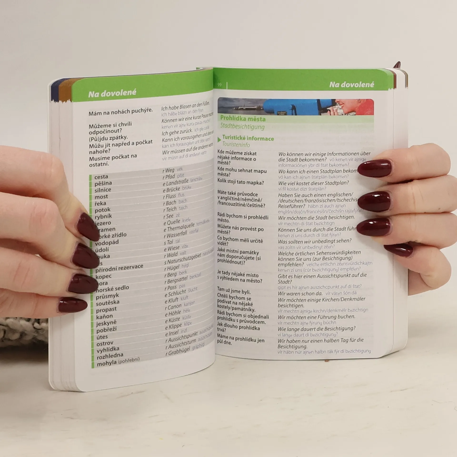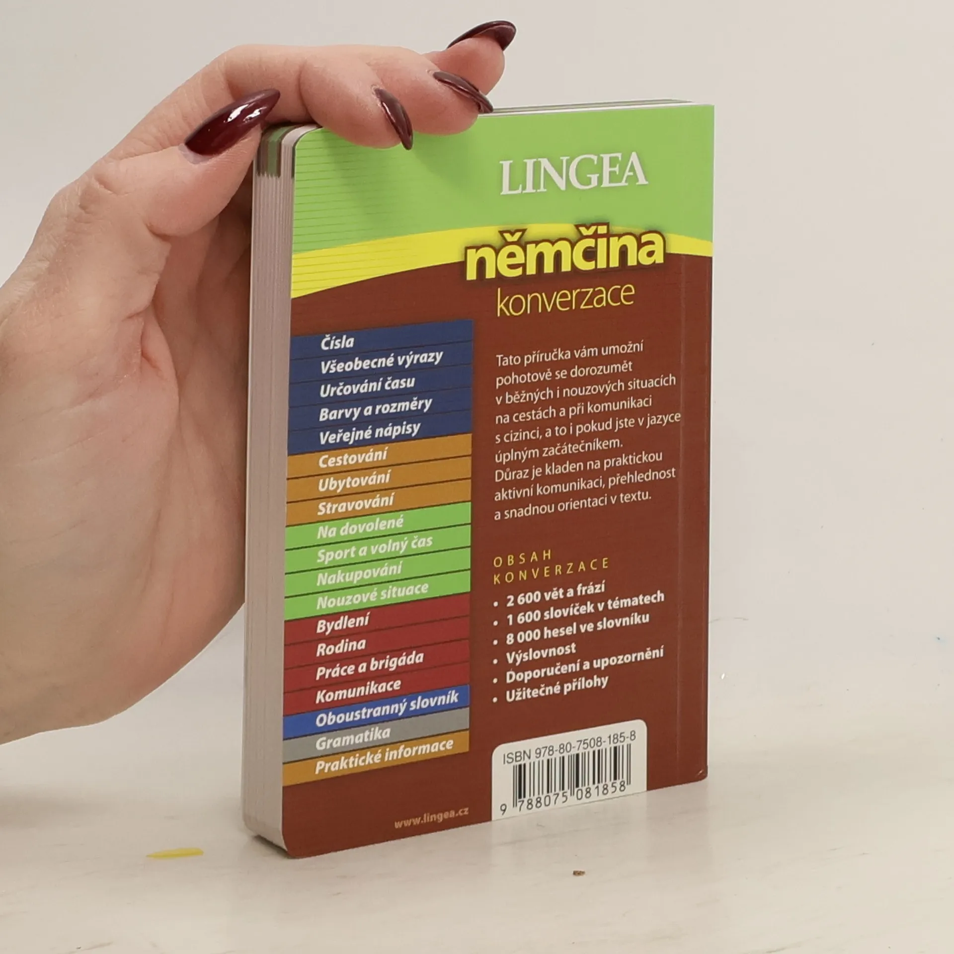 Praktická konverzační příručka obsahuje základní slovní zásobu pro běžné situace. Je uspořádána do tematických celků a doplněna stručným přehledem gramatiky, německo-českým a česko-německým slovníčkem a výběrem zajímavých reálií.Reálie a zajímavé praktické informace v závěru příručky se týkají Německa, Rakouska a Švýcarska.