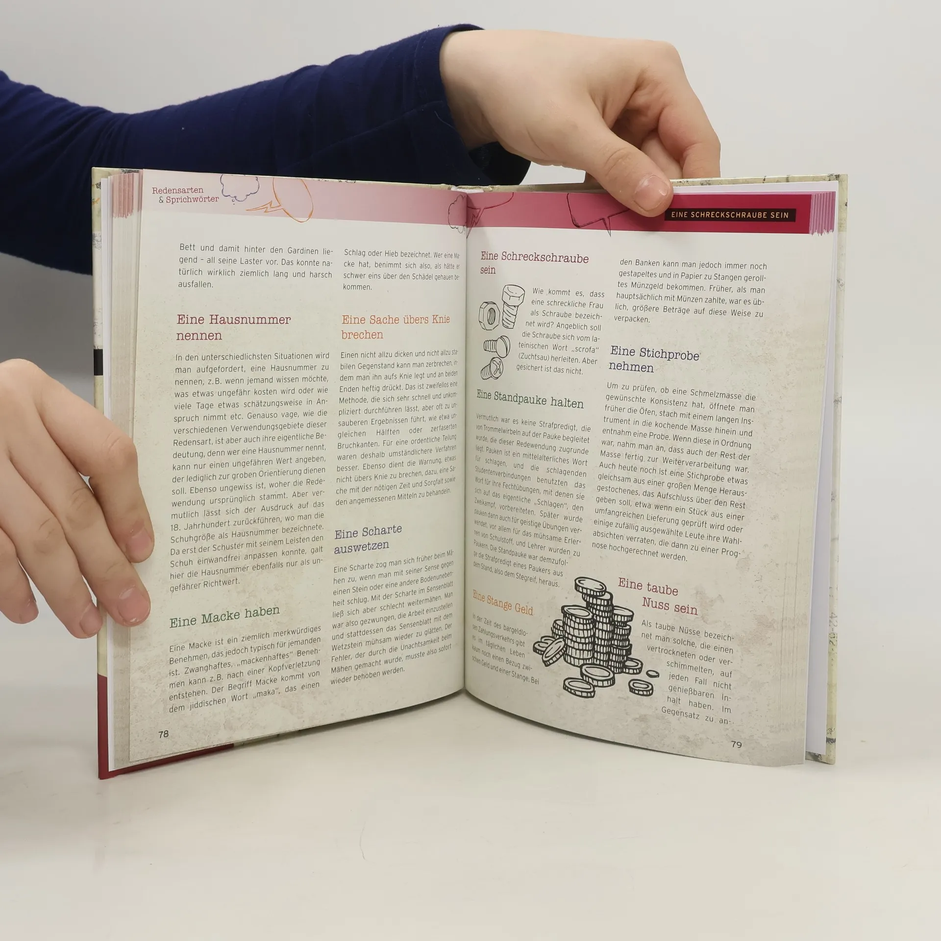 Entdecken Sie die Welt der Redensarten und Sprichwörter mit dieser umfassenden Sammlung, die über 700 der interessantesten Wendungen der deutschen Sprache präsentiert. Erfahren Sie die Bedeutung und Herkunft von Ausdrücken wie „etwas auf die lange Bank schieben“ oder „die Fliege machen“, die Sie täglich verwenden. Dieses Buch bietet nicht nur spannende Einblicke in die Sprache, sondern auch nützliches Wissen über die gängigsten Redewendungen, damit Sie in jeder Situation den passenden Spruch parat haben. Die anschaulichen Illustrationen und prägnanten Informationen lockern die Sammlung auf und machen das Lernen unterhaltsam. Verfasst von ZDF-Quiz-Champion Christa Pöppelmann, ist es ideal für alle, die sich für die kulturellen Hintergründe und den Kontext von idiomatischen Wendungen interessieren. Mit einem übersichtlichen, alphabetischen Register finden Sie schnell die gesuchte Redewendung. Die robuste Hardcover-Ausführung sorgt dafür, dass das Buch perfekt für den täglichen Gebrauch geeignet ist. Redewendungen sind oft so vertraut, dass wir ihre Ursprünge vergessen; dieses Buch hilft Ihnen, sie neu zu entdecken und in einem zeitgenössischen Kontext zu verstehen. Tauchen Sie ein in die faszinierende Welt der deutschen Sprache und erweitern Sie Ihr Wissen auf unterhaltsame Weise!