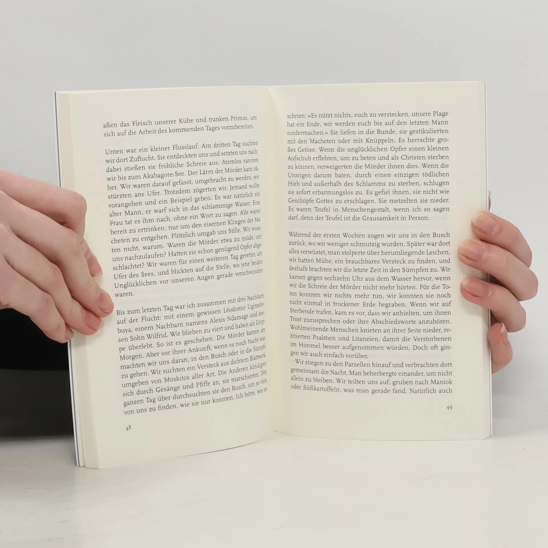 Ohne Unterlass durchstreift Englebert Munyambonwa, ein sechsundsechzig-jähriger Tutsi, die Straßen und Kneipen von Nyamata im Süden Ruandas – stets einen Witz auf den Lippen, ständig in Bewegung. Im Gehen weiche er der Schwarzseherei aus, sagt er. Er wolle sich nicht mehr erinnern. Doch nach ein paar Bier und aus Freundschaft zu dem französischen Journalisten, mit dem er so gern plaudert, beginnt Englebert zu erzählen: von einem Leben voller Brüche und Neuanfänge, von den ersten Verfolgungen durch Hutu in den sechziger Jahren und von den Hoffnungen junger afrikanischer Intellektueller. Immer wieder flammt der Hass zwischen Hutu und Tutsi auf und treibt Englebert mit seiner Familie zur Flucht. Und immer wieder kehren sie zurück – bis zum Massaker von Nyamata, bei dem 1994 mehr als 45.000 Menschen niedergemetzelt werden. Englebert überlebt in den Sümpfen, vier Wochen lang, jeden Tag aufs Neue bedroht. Kaum jemand hat sich der Aufarbeitung des Genozids in Ruanda derart verschrieben wie der französische Journalist und Romancier Jean Hatzfeld. Bei seinen Recherchen in Nyamata lernte Hatzfeld auch Englebert kennen. Nun leiht er ihm seine Stimme – für das so beeindruckende wie bedrückende Porträt eines Lebens und der ausweglosen Flucht vor der Erinnerung.