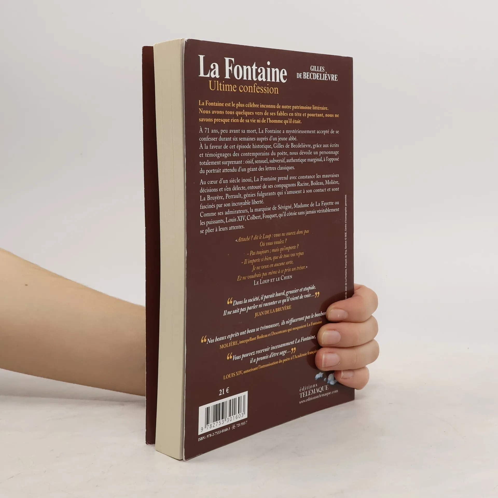 La Fontaine est le plus célèbre inconnu de notre patrimoine littéraire. Nous avons tous quelques vers de ses fables en tête et pourtant, nous ne savons presque rien de sa vie ni de l'homme qu'il était. A 71 ans, peu avant sa mort, La Fontaine a mystérieusement accepté de se confesser durant six semaines auprès d'un jeune abbé. A la faveur dé cet épisode historique, Gilles de Becdelièvre, grâce aux écrits et témoignages des contemporains du poète, nous dévoile un personnage totalement surprenant : oisif, sensuel, subversif, authentique marginal, à l'opposé du portrait attendu d'un géant des lettres classiques. Au coeur d'un siècle inouï, La Fontaine prend avec constance les mauvaises décisions et s'en délecte, entouré de ses compagnons Racine, Boileau, Molière, La Bruyère, Perrault, génies fulgurants qui s'amusent à son contact et sont fascinés par son incroyable liberté. Comme ses admirateurs, la marquise de Sévigné, Madame de La Fayette ou les puissants, Louis XIV, Colbert, Fouquet, qu'il côtoie sans jamais véritablement se plier à leurs attentes.