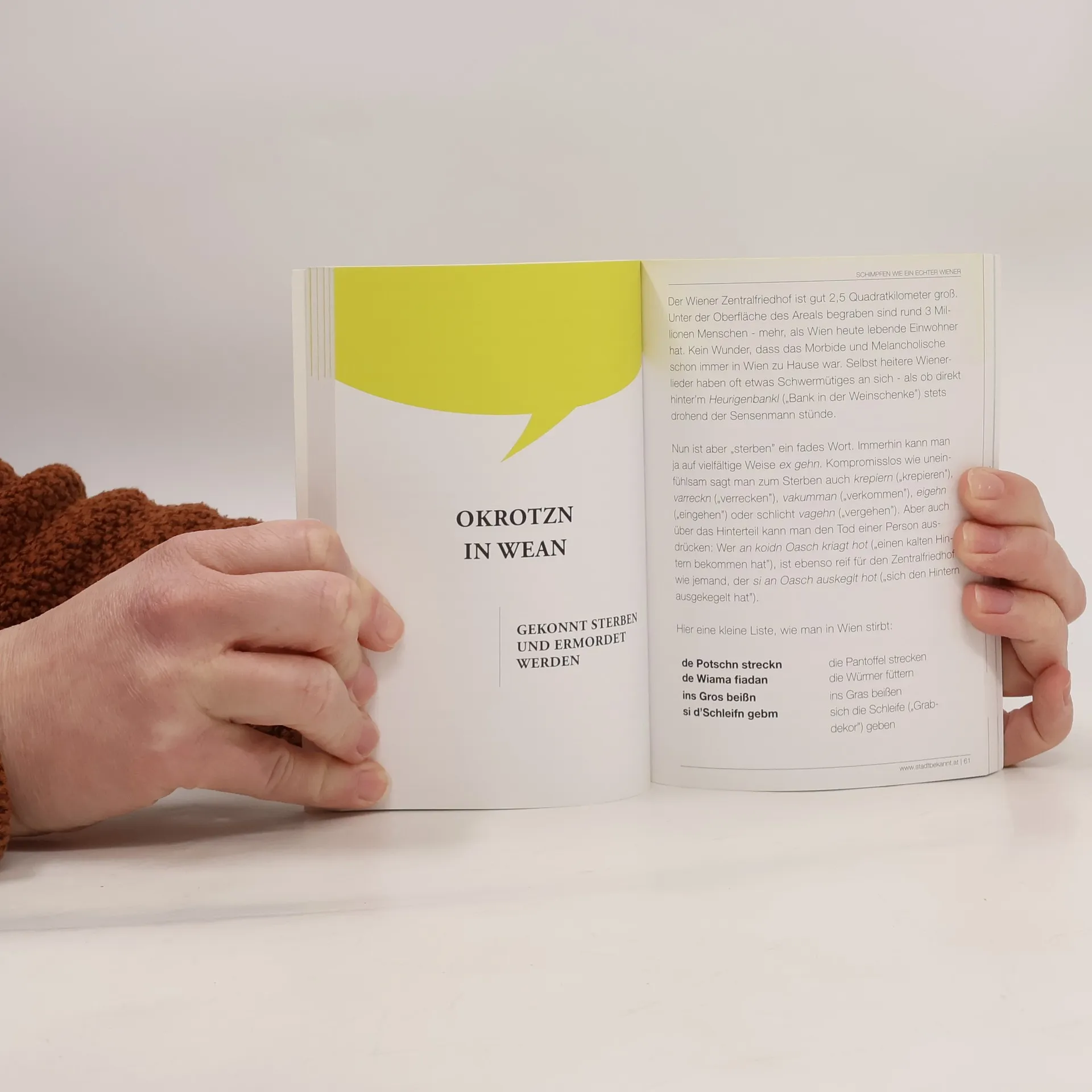 Wiener Kultur, das ist Kunst und Musikgenuss, Kaffee und Schnitzerl, sprühender Charme und fröhliche Weinseligkeit. A so a Schas! Mindestens genau so wichtig ist in Wien die Schimpfkultur, also die Fähigkeit, zu allem und jedem passende unhöfliche, witzig-beleidigende und obszöne Worte und Redewendungen zu finden. Stadtbekannt hat sich für das neue Kult(ur)werk „Schimpfen wie ein echter Wiener“ die absoluten Schmankerln aus dem Wortsumpf Wiens geangelt. Erfahren Sie alles Wissenswerte über hirnwaache Tschecheranten, Bettbrunzer, Schastrommeln, Sauzechn und Hendlpuderer. Lernen Sie, wie man gekonnt und stilvoll original wienerisch sudert, raunzt, wütet und Schmäh führt.
