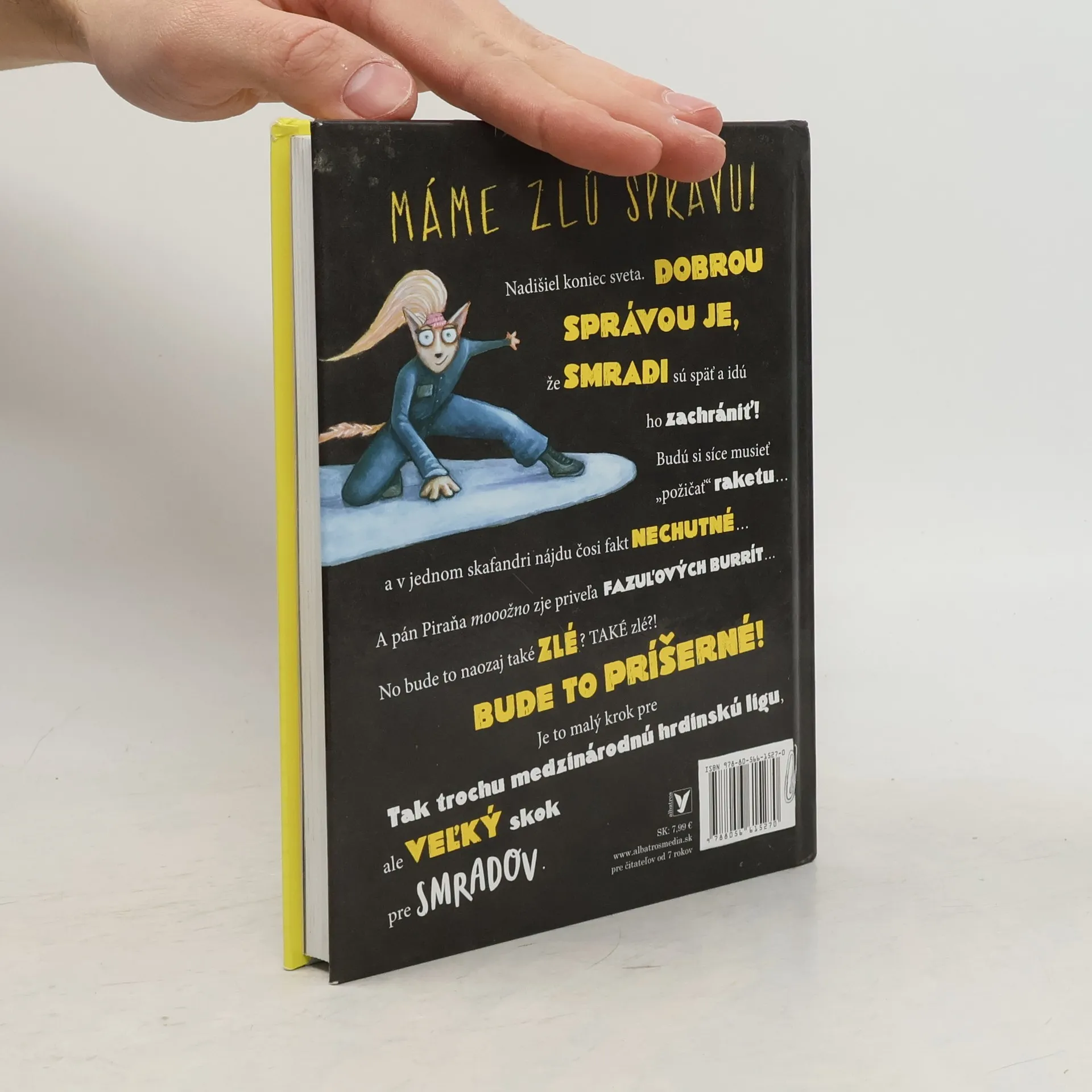 Máme zlú správu! Nadišiel koniec sveta. Dobrou správou však je, že SMRADI sú späť a idú ho zachrániť! Budú si síce musieť „požičať“ raketu, v jednom skafandri nájdu čosi fakt nechutné a pán Piraňa možno zje priveľa fazuľových burrít, no bude to naozaj také zlé? Také zlé?! Bude to príšerné. Je to malý krok pre Tak trochu medzinárodnú hrdinskú ligu, ale veľký skok pre SMRADOV.