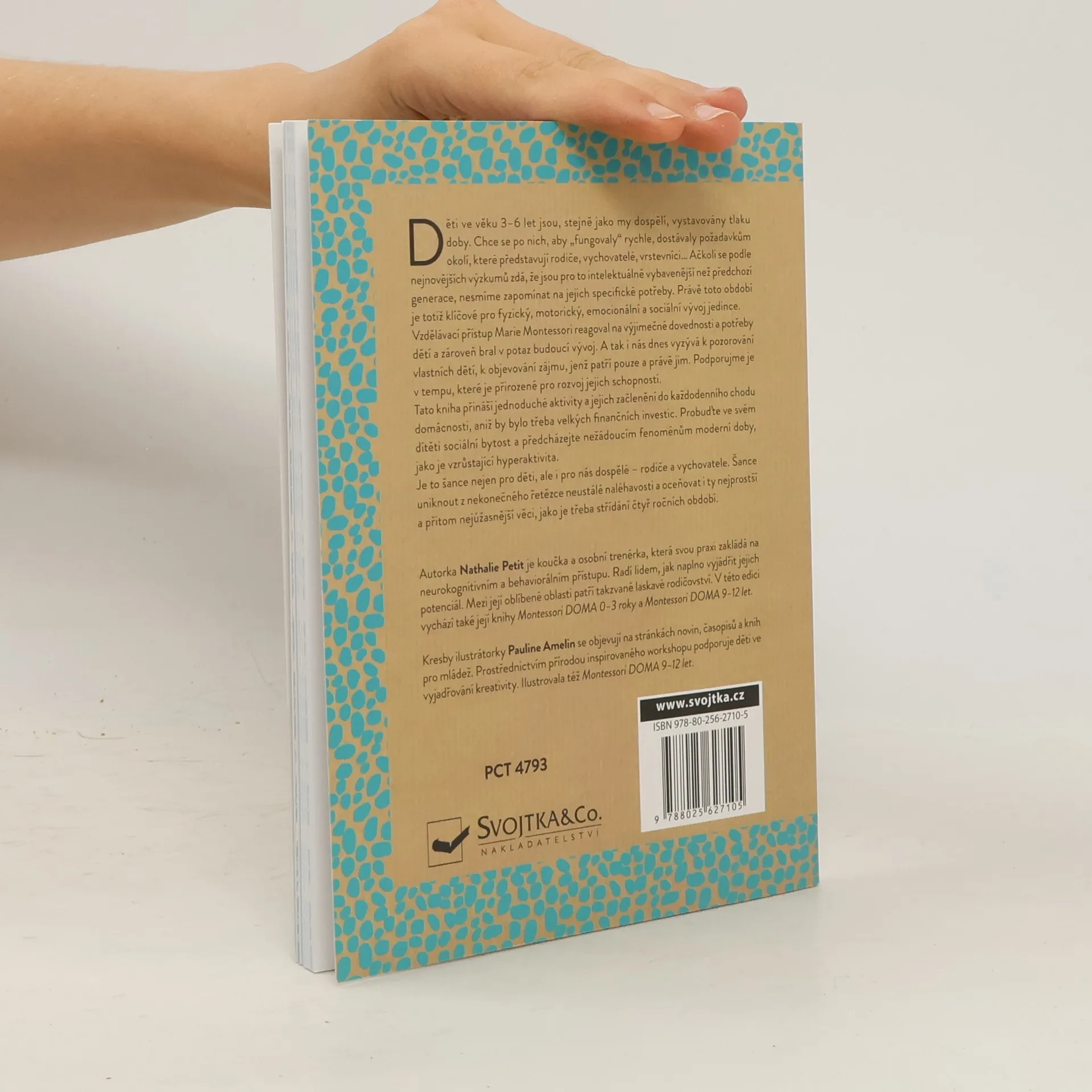 Děti ve věku 3-6 let jsou, stejně jako my dospělí, vystavovány tlaku doby. Chce se po nich, aby "fungovaly" rychle, dostávaly požadavkům okolí, které představují rodiče, vychovatelé, vrstevníci… Ačkoli se dle nejnovějších výzkumů zdá, že jsou pro to intelektuálně vybavenější než generace předchozí, nesmíme zapomínat na jejich specifické potřeby. Právě toto období je totiž klíčové pro fyzický, motorický, emocionální a sociální vývoj jedince. Vzdělávací přístup Marie Montessori na výjimečné dovednosti a potřeby dětí reagoval a zároveň bral v potaz budoucí vývoj. A tak i nás dnes vyzývá k pozorování vlastních dětí, k objevování zájmu, jež patří pouze a právě jim. Podporujme je v tempu přirozeném pro rozvoj jejich schopností. Jednoduché aktivity, jejich začlenění do každodenního chodu domácnosti bez nutnosti velkých finančních investic - to přináší tato kniha. Probuďte ve svém dítěti sociální bytost a předcházejte nežádoucím fenoménům moderní doby, jako je vzrůstající hyperaktivita. Je to šance nejen pro děti, ale i pro nás dospělé - rodiče a vychovatele. Šance uniknout z nekonečného řetězce neustálé naléhavost a oceňovat i ty nejprostší a přitom nejúžasnější věci, jako je třeba střídání čtyř ročních období.