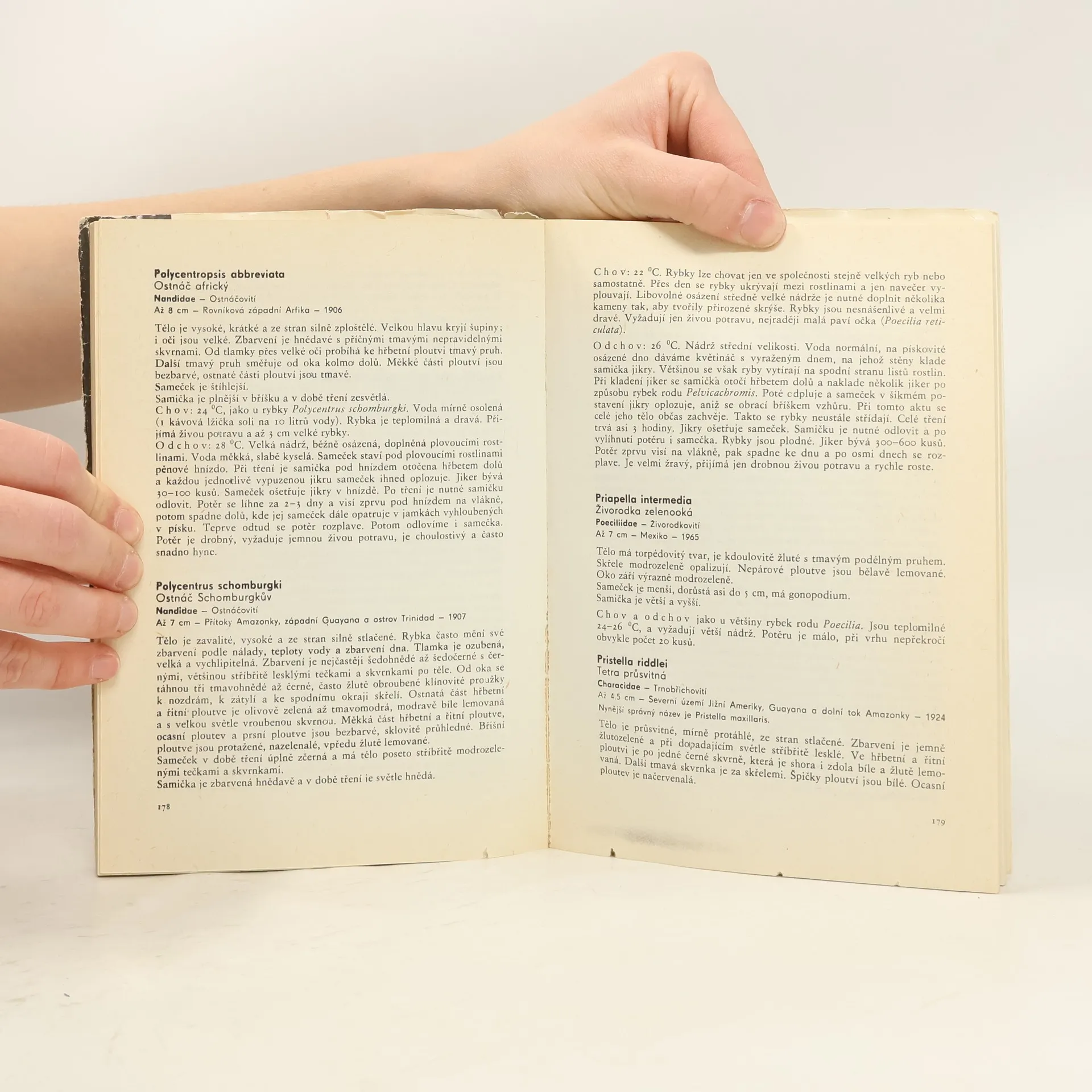 Při popisu jednotlivých druhů akvarijních ryb uvádí autor kromě latinského a českého názvu i příslušnou čeleď, maximální velikost, místo původu, rok dovozu do Evropy, popis ryby, její chov a odchov. Publikace je uvedenavšeobecnou statí o chovu akvarijních ryb, jejich krmení apod. 8. upravené vydání.