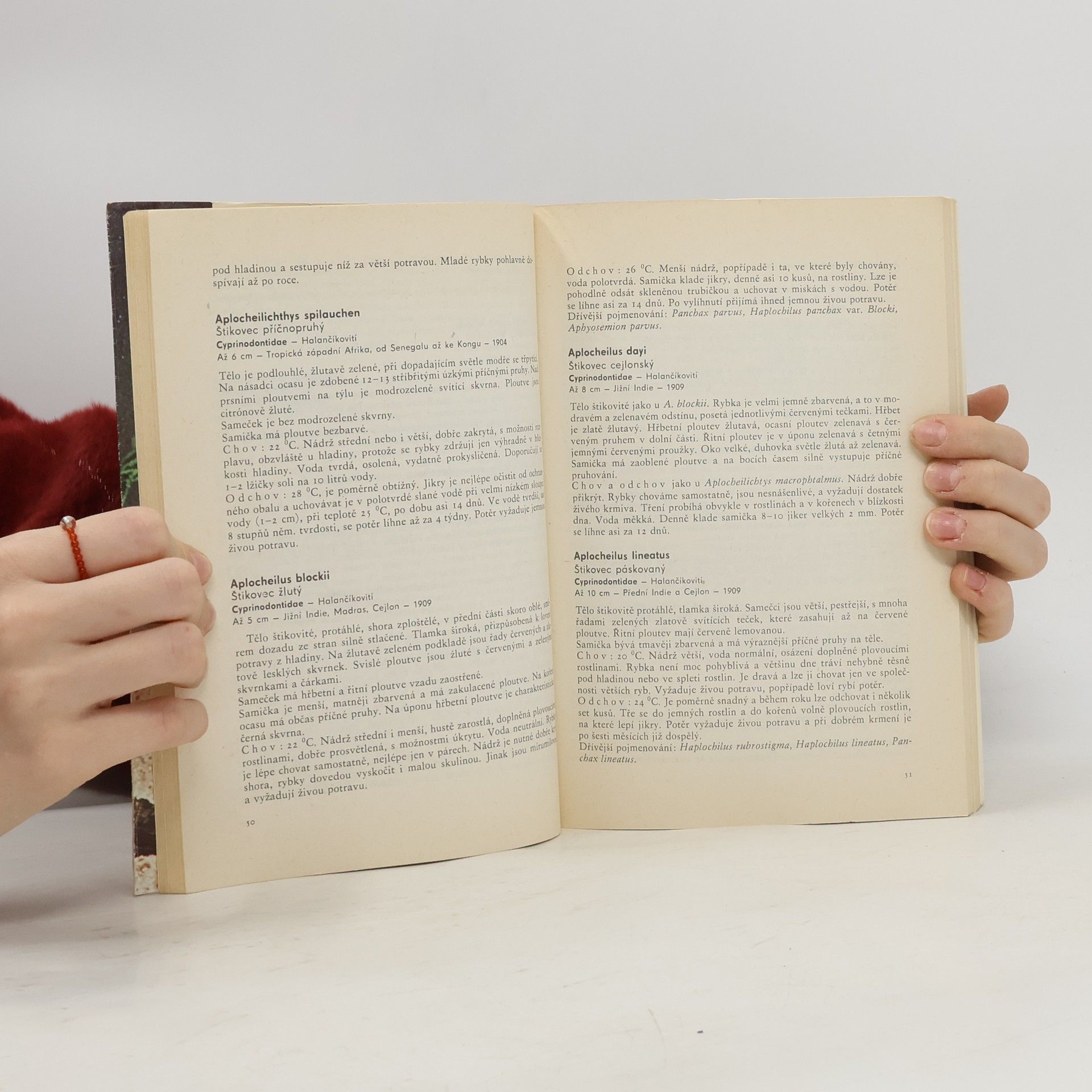 Při popisu jednotlivých druhů akvarijních ryb uvádí autor kromě latinského a českého názvu i příslušnou čeleď, maximální velikost, místo původu, rok dovozu do Evropy, popis ryby, její chov a odchov. Publikace je uvedenavšeobecnou statí o chovu akvarijních ryb, jejich krmení apod. 8. upravené vydání.