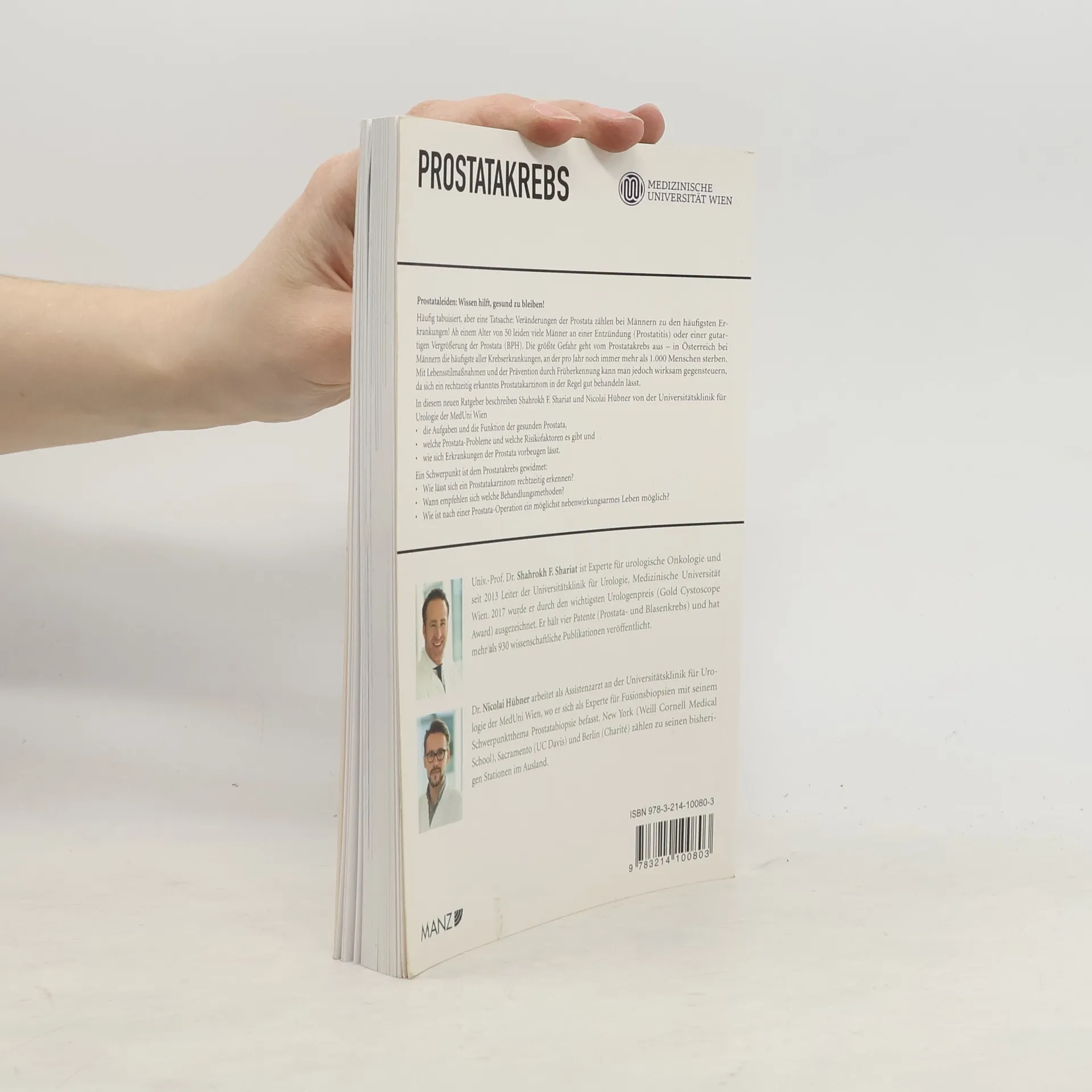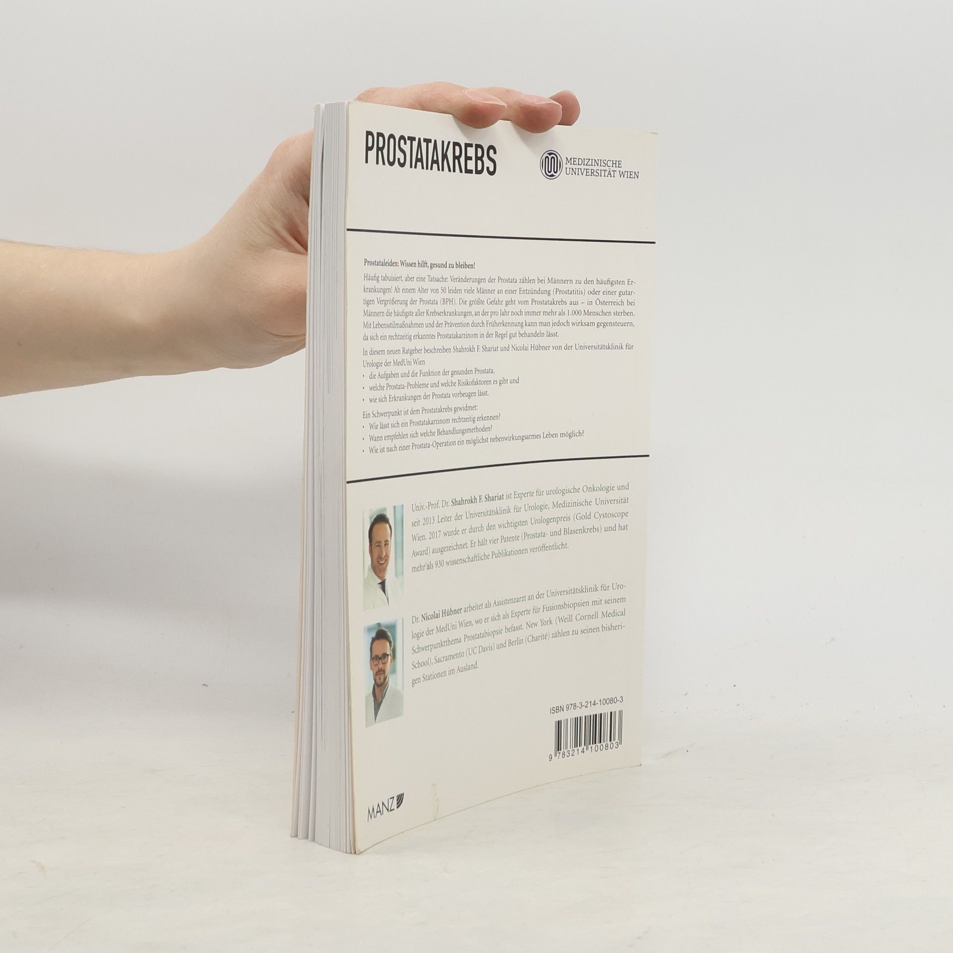 Häufig tabuisiert, aber eine Tatsache: Veränderungen der Prostata zählen bei Männern zu den häufigsten Erkrankungen. Die größte Gefahr geht vom Prostatakrebs aus – in Österreich bei Männern die häufigste aller Krebserkrankungen, an der pro Jahr noch immer mehr als 1.000 Menschen sterben. Ein rechtzeitig erkanntes Prostatakarzinom lässt sich in der Regel gut behandeln. Genaue Kenntnis der Erkrankung hilft bei der Prävention und Behandlung. In diesem neuen Ratgeber in Kooperation von MedUni Wien und MANZ Verlag beantworten Shahrokh F. Shariat und Nicolai Hübner von der Universitätsklinik für Urologie der Medizinischen Universität Wien folgende Fragen: Wie lässt sich ein Prostatakarzinom rechtzeitig erkennen? Wann empfehlen sich welche Behandlungsmethoden? Was ist die Prostata überhaupt – und was macht sie? Was kann ein erhöhter PSA-Wert bedeuten? Warum ist Krebs nicht gleich Krebs? Und: Wie ist der aktuelle Stand der Wissenschaft bei Diagnose und Therapie?
