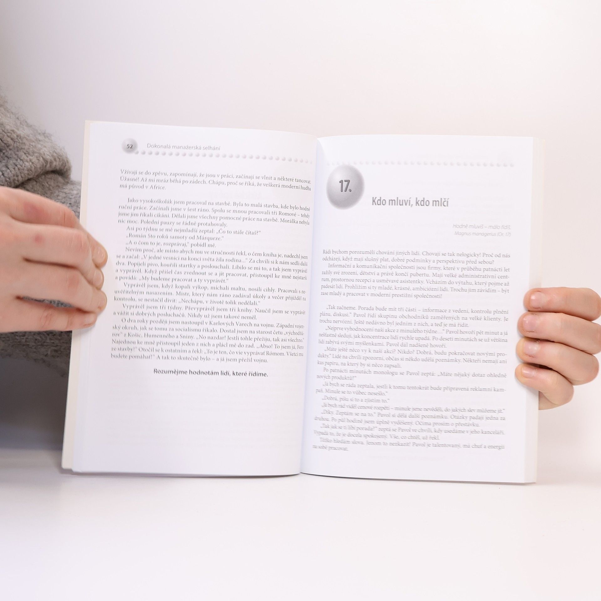 Jestliže hledáte recept na úspěšné řízení, chcete zjistit, zda jste perfektní manažer, nebo nalézt dokonalou manažerskou teorii platnou pro dvacáté první století, pak jste nenašli tu správnou knihu. Pokud vás ale zajímá, jak můžete použít osobní zkušenosti v manažerské praxi nebo se chcete z vlastních i cizích chyb poučit a využít je pro úspěšné řízení, určitě bude stát za to, si tuto knihu přečíst. V celkem 52 životních příbězích autor odhalí zajímavé souvislosti s manažerskými problémy. Ocitnete se uprostřed otevřených dialogů mezi manažerem a koučem. Pravdivé, poutavé a pestré příběhy vás nenechají vydechnout. Nebudete se nudit, ani když si knížku přečtete čistě pro radost a zábavu. Příběhy přinášejí poselství a zásady, které uplatníte nejen jako manažer, ale i v každodenním běžném životě.