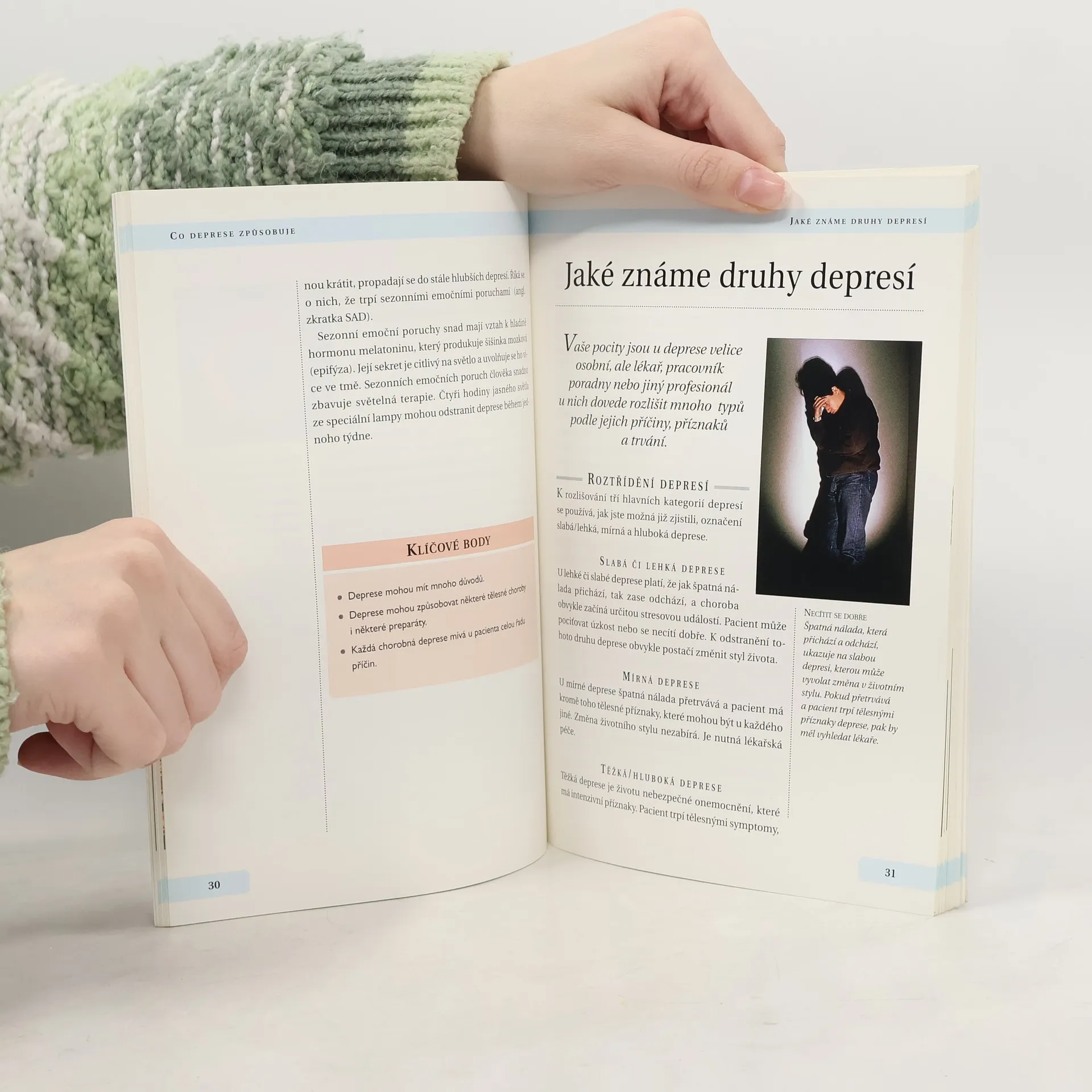 Autor vysvětluje, co deprese jsou, jak lidé prožívají smutek, řeší problémy a stresy, které přináší dnešní doba a způsob života. Zvláštní pozornost je věnována depresím žen. Další kapitoly vysvětlují, jak se deprese léčí, seznamují s hlavními skupinami léků (antidepresiv) a mechanismem jejich působení, navrhují i alternativní metody léčby a především radí nemocným i jejich příbuzným, jak pomáhat sami sobě. Kniha je doplněna různými obrázky, tabulkami, fotografiemi, přehledy a grafy i kontakty na odborná pracoviště v ČR.