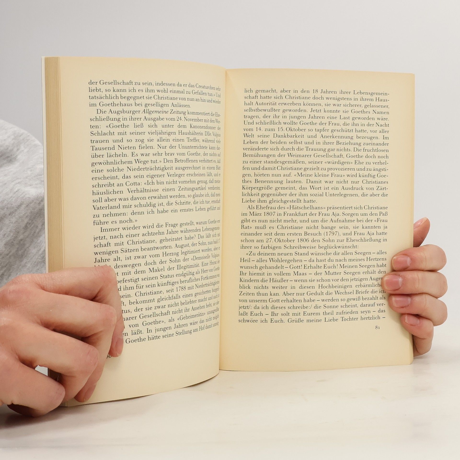 Gegensätzlicher kann man sich eine Partnerschaft von zwei Menschen kaum vorstellen als die zwischen Goethe und seiner Frau Christiane, die von der Weimarer Gesellschaft und später von den Literaturhistorikern als 'Bettschatz' und 'Dummchen' tituliert wurde. Kleßmann, ausgewiesener Kenner der Goethezeit, 'korrigierte die überkommenen Klischees, und er entwarf mit dem schönen Elan der Sympathie ein gerechteres Bild der jungen Frau', die mehr war als die sinnliche Geliebte, die umsichtige Wirtschafterin und sorgende Mutter: Sie war für Goethe 'die unvergleichliche Partnerin im Reich der guten Täglichkeit, deren Liebe er mit Liebe erwiderte und für deren Wärme er mit Wärme dankte, des dauerhaften Vergnügens, das sie ihm bescherte, niemals überdrüssig' (Klaus Harprecht, Die Zeit).