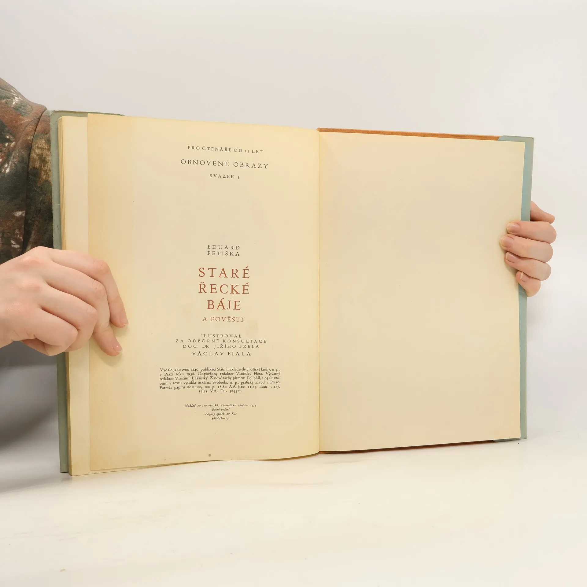 Půvabné Petiškovo převyprávění řecké mytologie je určeno čtenářům od 9 let. Čtenář navštíví rozmanité starověké kraje, seznámí se se záhadnými bytostmi a podivuhodnými zvířaty, pozná moc i slabosti olympských bohů a v úžasu se zastaví před odvážnými skutky a dobrodružstvími bájeslovných hrdinů, promlouvajících přes propast času svou životností i dnes. Kapitoly: Prometheus, Potopa, Faethon, Orfeus, Založení Théb, Pentheus, Midas, Tantalos, Pelops, Niobe, O zlatém rounu, Iason a Medea, Herakles, Perseus, Daidalos a Ikaros, Theseus, Sisyfos, Bellerofontes, Oidipus a Antigone, Filemon a Baucis, Eros a Psyche, Gyges a prsten, Trojská válka, Orestes, Odysseovy cesty, Poslední příběh, který není ani bájí ani pověstí. První vydání. Cena knihy v čase vydání: 27.- Kčs.