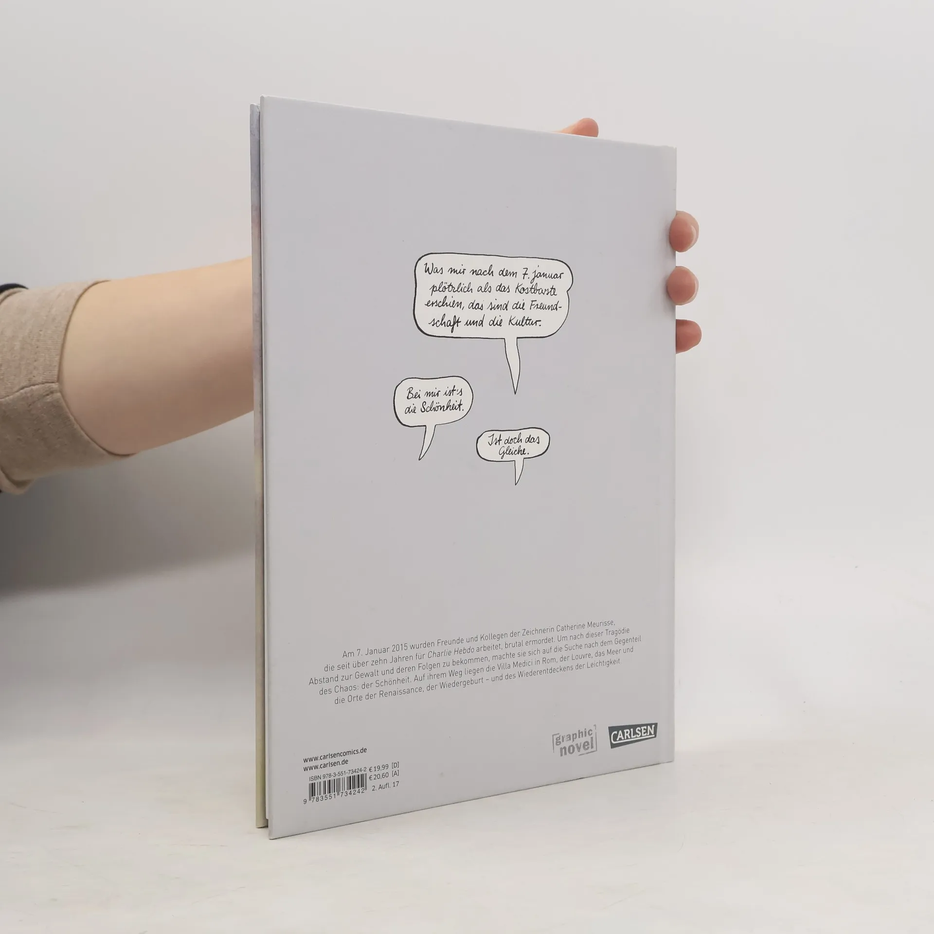 Die Karikaturistin Catherine Meurisse, die seit vielen Jahren für Charlie Hebdo arbeitet, entkommt dem Attentat auf Charlie Hebdo nur, weil sie an diesem Morgen im Januar 2015 für die Redaktionssitzung zu spät dran ist. Viele ihrer Kollegen und Freunde werden bei dem Anschlag aus dem Leben gerissen. Sie selbst sucht seitdem nach einem Umgang mit der Tragödie und einem neuen Zugang zu ihrem Leben. Meurisse sucht in der Schönheit der Natur und der Künste nach anderen Bildern, macht sich nach Italien auf und beginnt langsam, zu ihrer eigenen Leichtigkeit zurückzufinden. Mit „Die Leichtigkeit“ hat Catherine Meurisse ein intensives und sehr persönliches Buch geschaffen, das ihrer Trauer Raum gibt und zugleich eine Ermutigung ist, sich die Schönheit des Lebens zurückzuerobern.