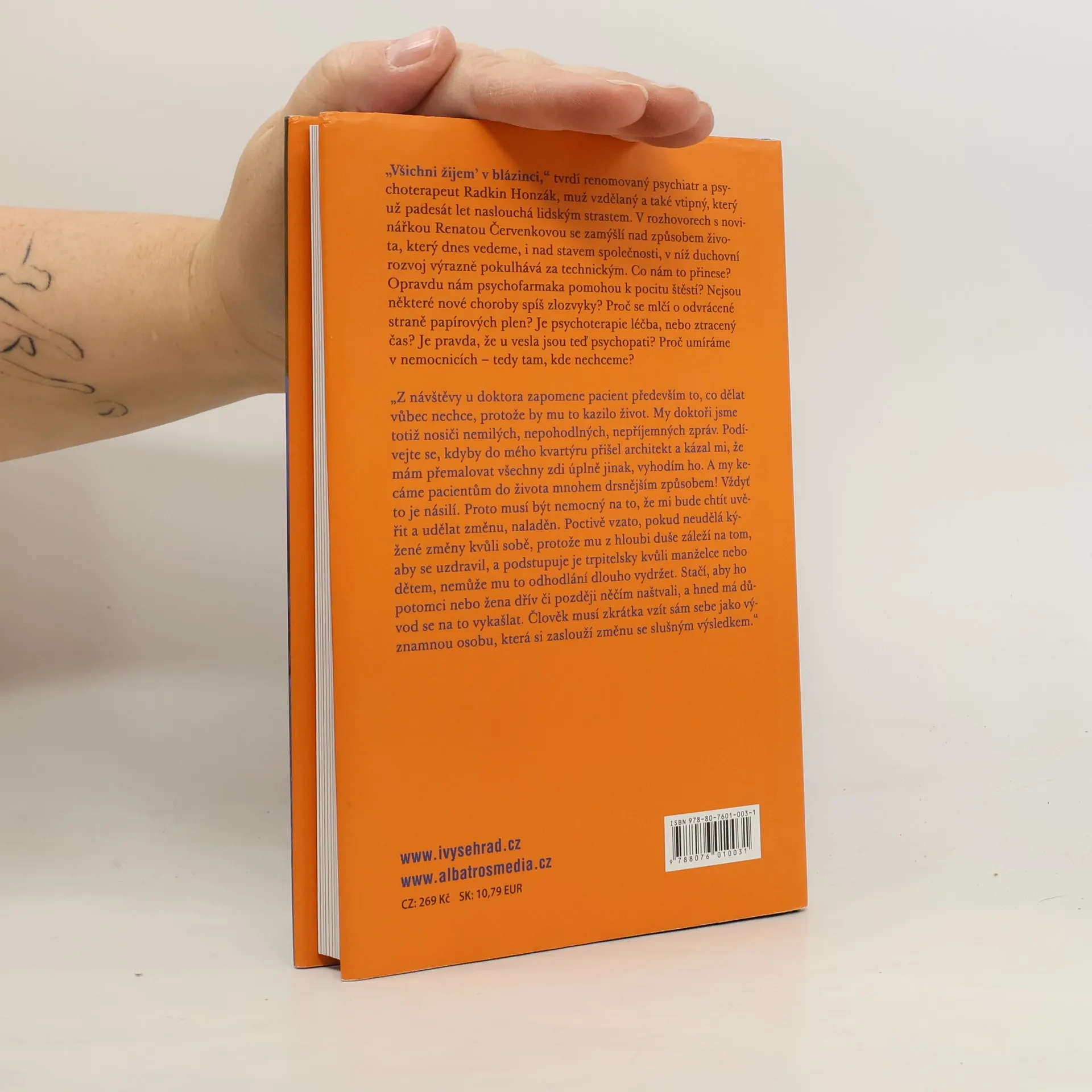 Renomovaný psychiatr a psychoterapeut Radkin Honzák, s padesátiletou praxí naslouchání lidským strastem, v rozhovorech s novinářkou Renatou Červenkovou zkoumá náš způsob života a stav společnosti, kde duchovní rozvoj zaostává za technickým pokrokem. Zajímá se o otázky jako: Jaké důsledky má náš životní styl? Opravdu psychofarmaka vedou k pocitu štěstí? Jsou některé nové choroby spíše zlozvyky? Proč se mlčí o negativních aspektech papírových plen? Je psychoterapie skutečnou léčbou, nebo ztraceným časem? A proč umíráme v nemocnicích, kde to nechceme? Tato témata nejsou příliš povzbudivá, ale Honzák je komentuje s nadhledem a ironií, upozorňující na fenomény dnešní doby, které se „příčí Matce přírodě“ a zajišťují psychiatrům dostatek pacientů do budoucna. Radkin Honzák (* 1939) absolvoval Fakultu všeobecného lékařství UK v Praze v roce 1962 a od té doby pracoval v různých psychiatrických institucích, včetně IKEM a PL Bohnice, kde se věnoval výzkumu a ambulantní psychiatrii. Dnes působí jako asistent na 1. Lékařské fakultě UK.
