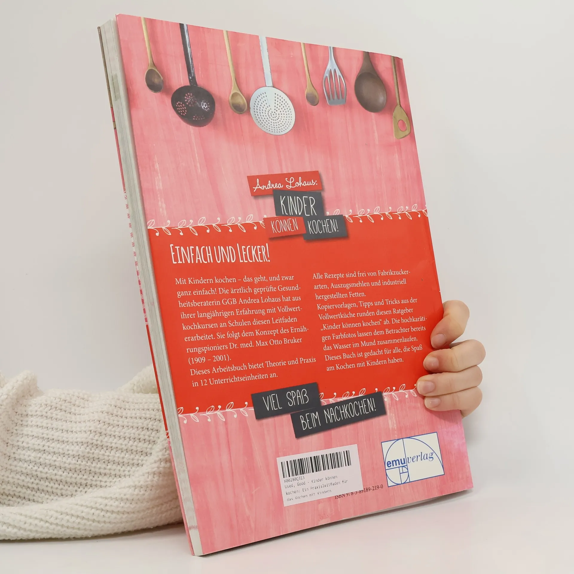 Einfach und lecker! Mit Kindern kochen - das geht, und zwar ganz einfach! Die ärztlich geprüfte Gesundheitsberaterin GGB Andrea Lohaus hat aus ihrer langjährigen Erfahrung mit Vollwertkochkursen an Schulen diesen Leitfaden erarbeitet. Sie folgt dem Konzept des Ernährungspioniers Dr. med. Max Otto Bruker (1909 - 2001) Dieses Arbeitsbuch bietet Theorie und Praxis in 12 Unterrichtseinheiten an. Alle Rezepte sind frei von Fabrikzuckerarten, Auszugsmehlen und industriell hergestellten Fetten. Kopiervorlagen, Tipps und Tricks aus der Vollwertküche runden diesen Ratgeber „Kinder können kochen“ ab. Die hochkarätigen Farbfotos lassen dem Betrachter bereits das Wasser im Mund zusammenlaufen. Dieses Buch ist gedacht für alle, die Spaß am Kochen mit Kindern haben.