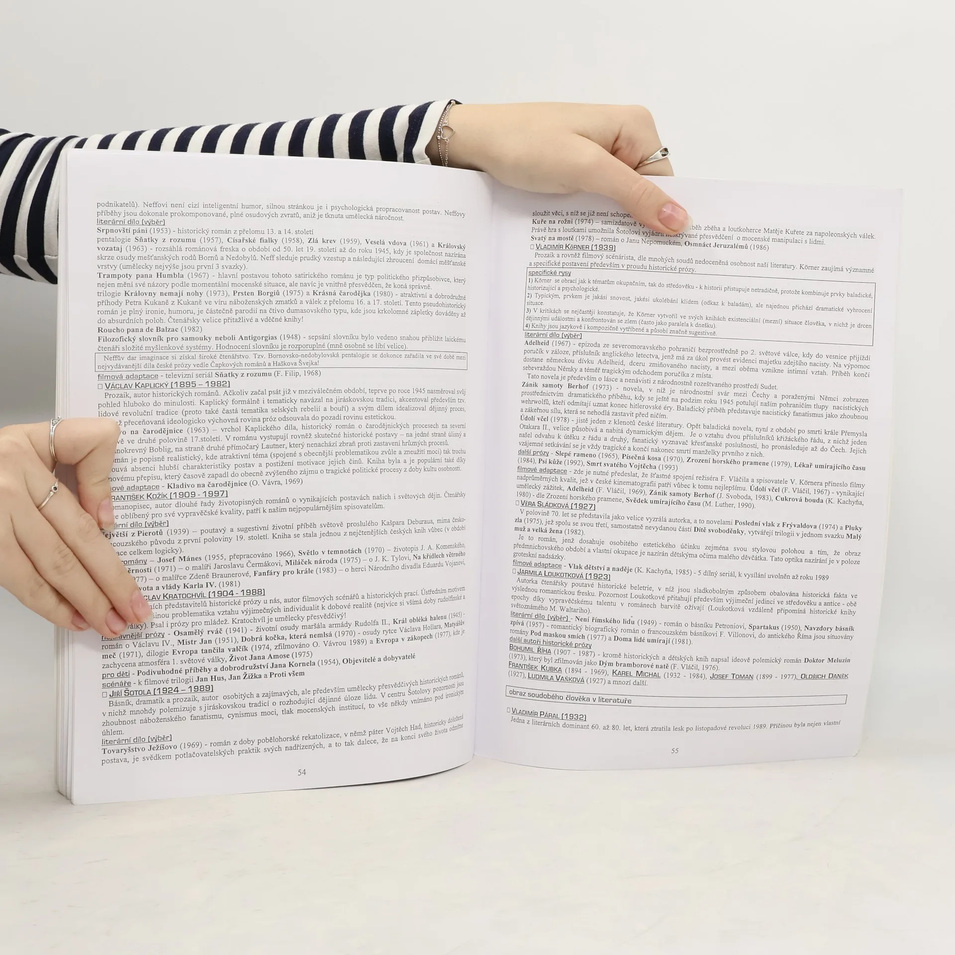 Přehled všech výrazných tendencí v české literatuře 20. století. Podrobnější medailony všech velkých osobností české literatury (autoři nejsou násilně kouskováni dle politických údobí). U důležitých literárních děl stručné obsahy a interpretace. Přehled filmových adaptací většiny literárních děl, politické souvislosti,mnohé zajímavosti. Text je graficky přehledně členěn, nejedná se o pouhý „telefonní“ seznam.