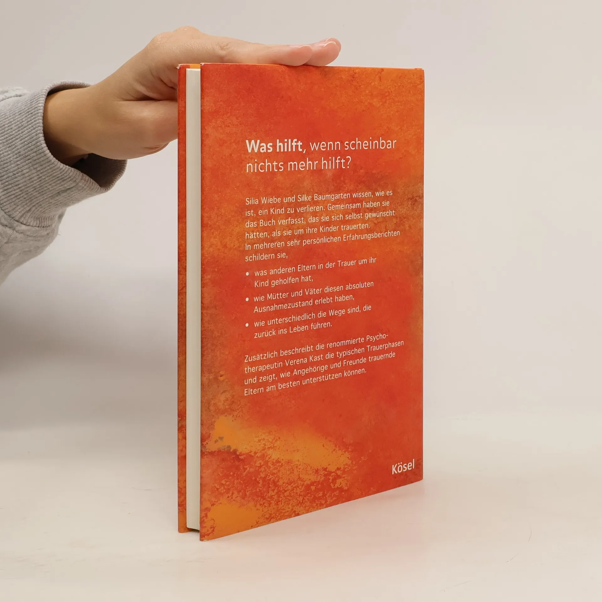 Wenn es scheinbar keinen Trost gibt Die beiden Autorinnen wissen wie es ist, ein Kind zu verlieren. Gemeinsam schrieben sie das Buch, das sie sich selbst gewünscht hätten, als sie um ihr Kind trauerten. Dieses Buch holt betroffene Eltern in der absoluten Ausnahmesituation ab. Es beschreibt auch anhand von sehr persönlichen Berichten anderer Eltern viele Möglichkeiten, mit diesem Schicksal umzugehen und den eigenen Weg aus der Trauer zu finden. Die renommierte Psychologin Verena Kast erklärt zudem die typischen Trauerphasen und beschreibt, wie Angehörige und Freunde trauernde Eltern am besten unterstützen können. Wahre Geschichten, die zum Weiterleben ermutigen In Zusammenarbeit mit der bekannten Trauerexpertin Verena Kast