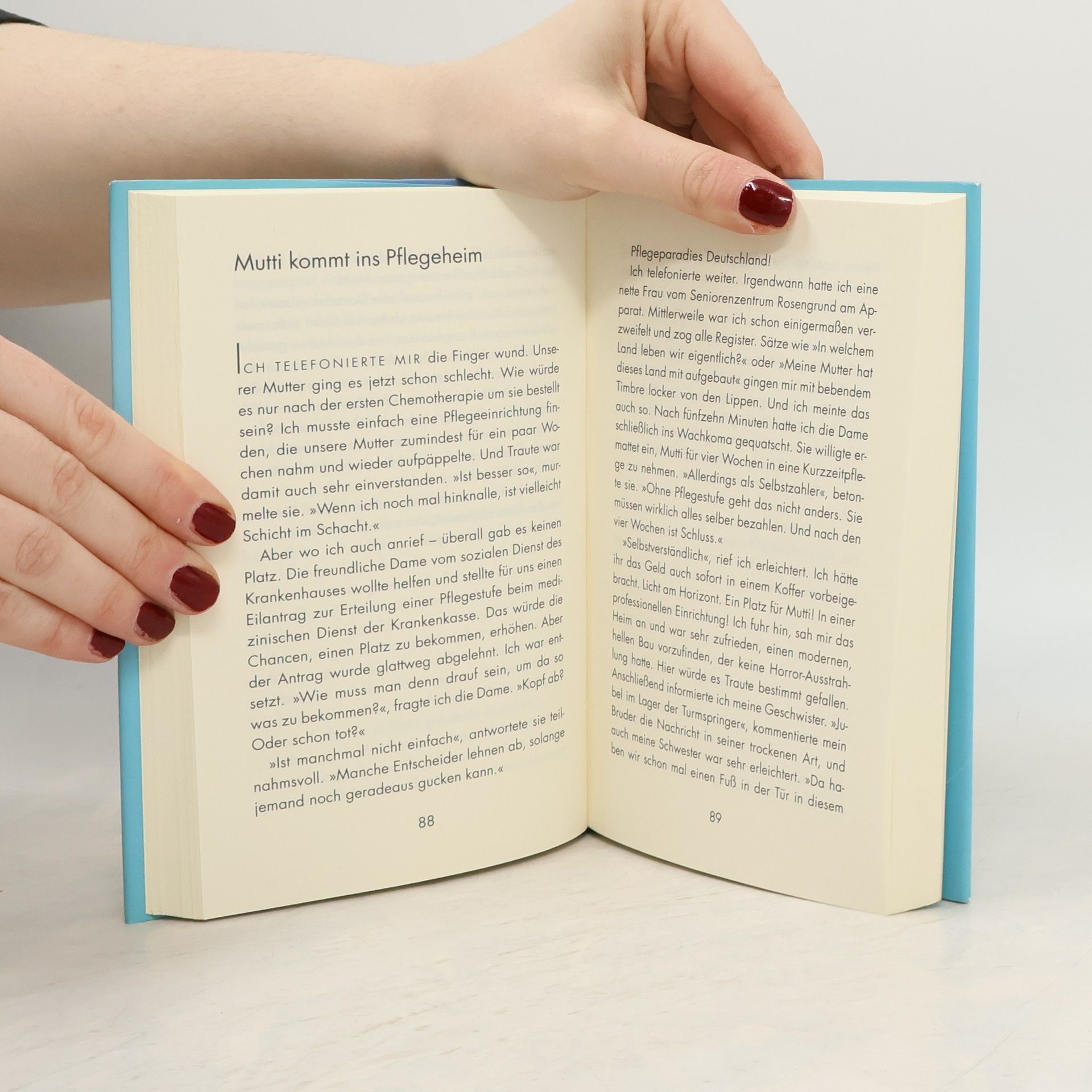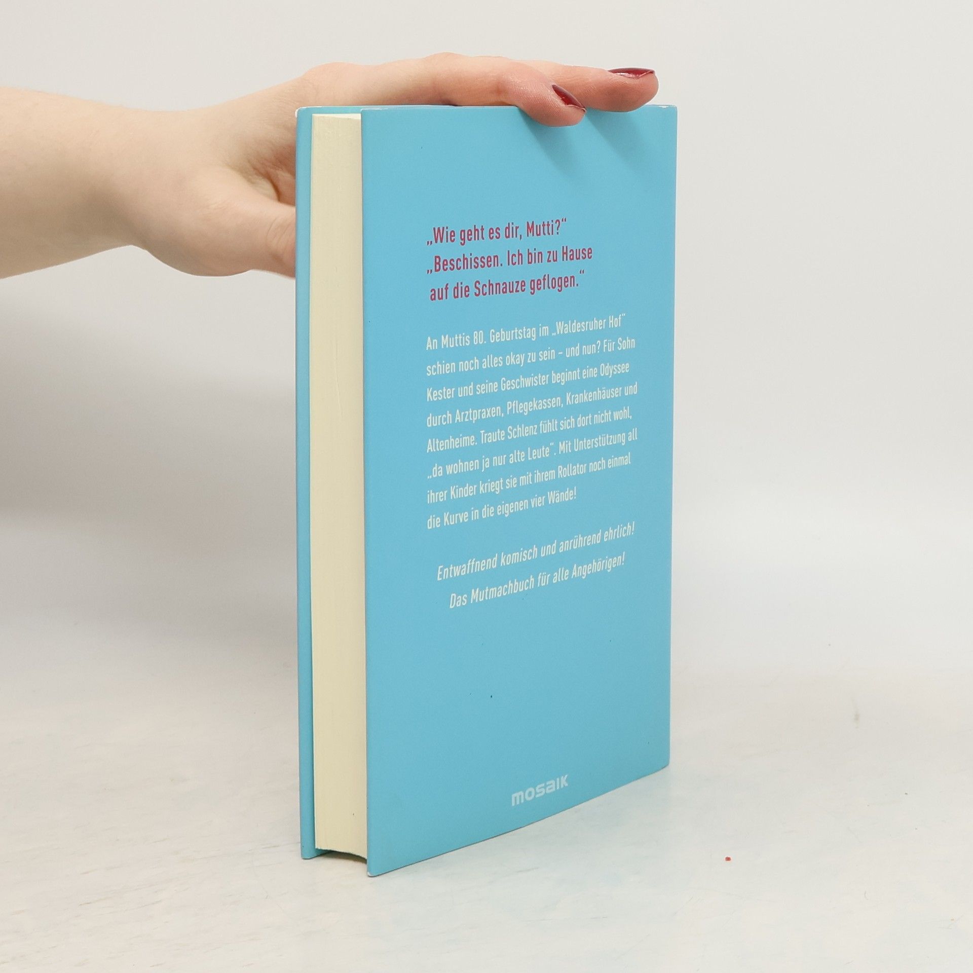 An Muttis 80. Geburtstag im „Waldesruher Hof“ war noch alles okay – und nun? „Wie geht es dir, Mutti?“ „Beschissen. Ich bin zuhause auf die Schnauze geflogen.“ Für Sohn Kester und seine Geschwister beginnt eine Odyssee durch Arztpraxen, Pflegekassen, Krankenhäuser und Altersheime. Traute Schlenz fühlt sich dort nicht wohl, „da wohnen ja nur alte Leute“. Aber sie kämpft tapfer in der ihr eigenen, raubeinigen Art – und nach dem Motto „Fack ju, Pflegeheim!“ kriegt sie mit ihrem Rollator tatsächlich noch einmal die Kurve! Das Mutmachbuch für alle Angehörigen, entwaffnend komisch und anrührend ehrlich!