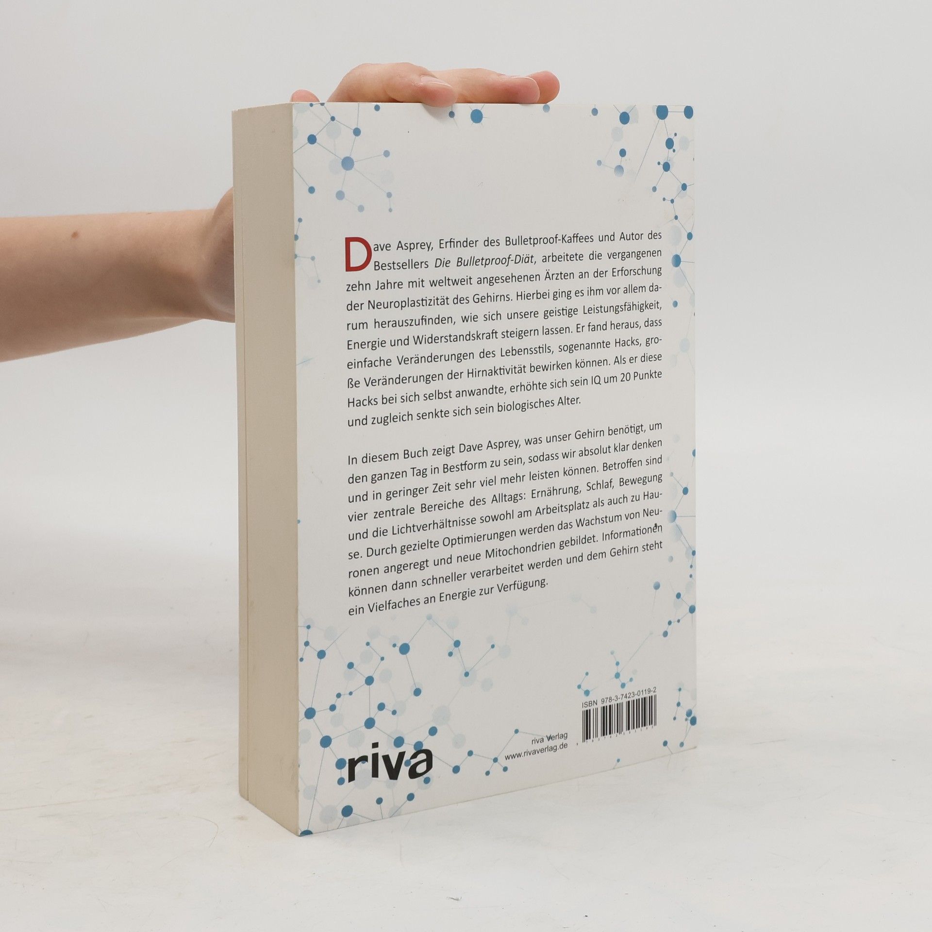 Dave Asprey, Erfinder des Bulletproof-Kaffees und Autor des Bestsellers Die Bulletproof-Diät, arbeitete die vergangenen zehn Jahre mit weltweit angesehenen Ärzten an der Erforschung der Neuroplastizität des Gehirns. Hierbei ging es ihm vor allem darum herauszufinden, wie sich unsere geistige Leistungsfähigkeit, Energie und Widerstandskraft steigern lassen. Er fand heraus, dass einfache Veränderungen des Lebensstils, sogenannte „Hacks“, große Veränderungen der Hirnaktivität bewirken können. Als er diese Hacks bei sich selbst anwandte, erhöhte sich sein IQ um 20 Punkte und zugleich senkte sich sein biologisches Alter. In seinem neuen Buch Hirntuning zeigt Asprey, was unser Gehirn benötigt, um den ganzen Tag in Bestform zu sein, sodass wir absolut klar denken und in geringer Zeit sehr viel mehr leisten können. Betroffen sind vier zentrale Bereiche des Alltags: Ernährung, Schlaf, Bewegung und die Beleuchtung sowohl am Arbeitsplatz als auch zu Hause. Werden hier gezielte Optimierungen vorgenommen, werden das Wachstum von Neuronen angeregt und neue Mitochondrien gebildet. Informationen können dann schneller verarbeitet werden und dem Gehirn steht ein Vielfaches an Energie zur Verfügung.