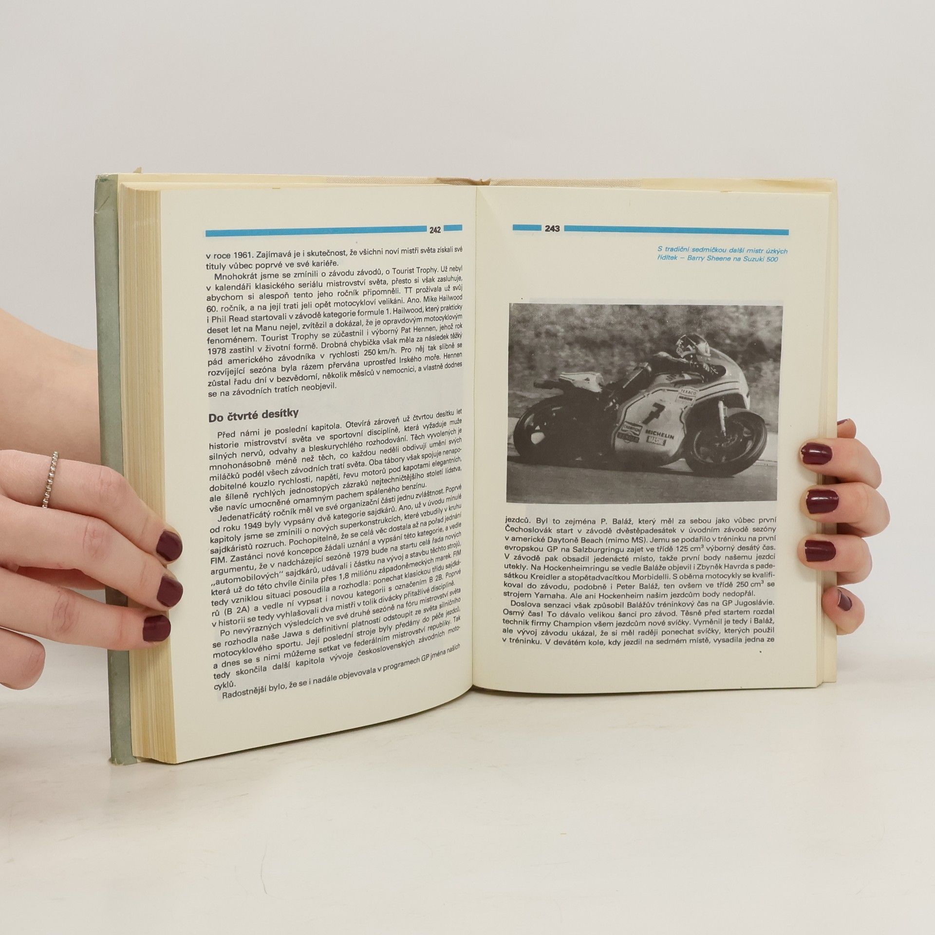 Kniha zachycuje vzrušující prostředí Velkých cen motocyklových silničních závodů zařazených do mistrovství světa.