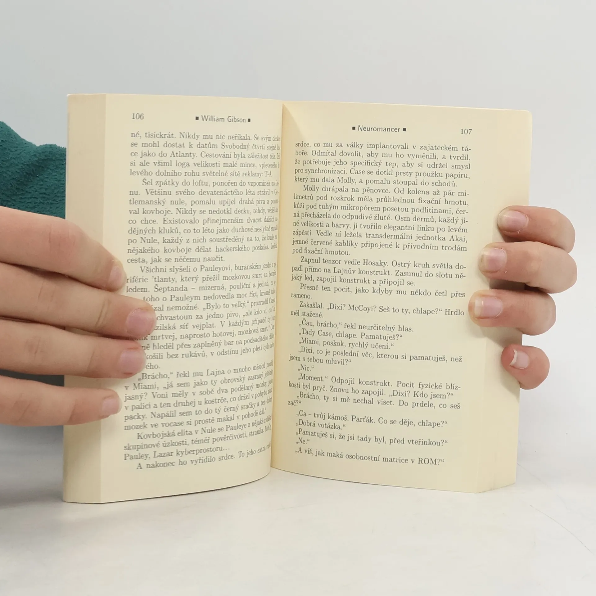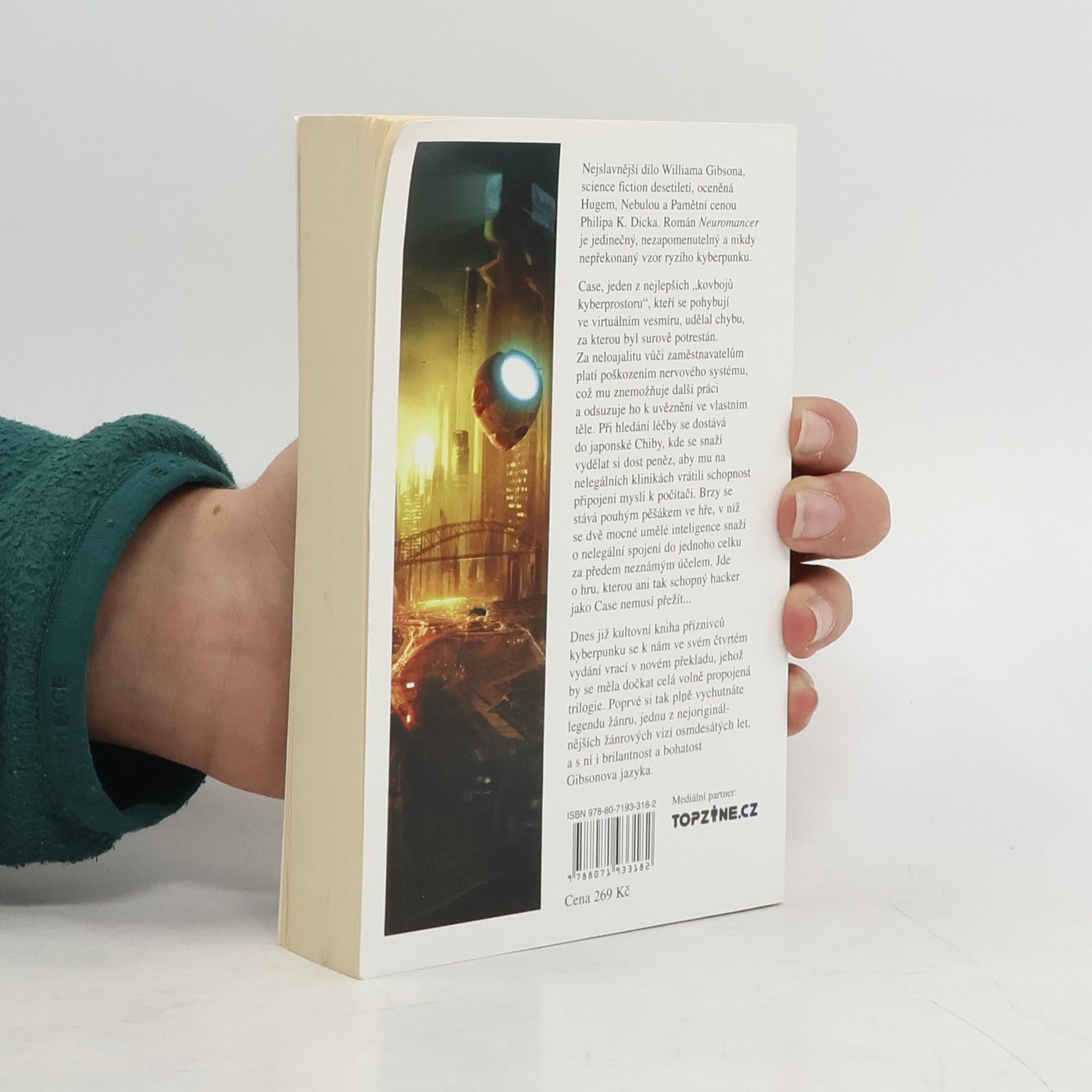 Case, jeden z nejlepších „kovbojů kyberprostoru“, kteří se pohybují ve virtuálním vesmíru, udělal chybu, za kterou byl surově potrestán. Za neloajalitu vůči zaměstnavatelům platí poškozením nervového systému, což mu znemožňuje další práci a odsuzuje ho k uvěznění ve vlastním těle. Při hledání léčby se dostává do japonské Chiby, kde se snaží vydělat si dost peněz, aby mu na nelegálních klinikách vrátili schopnost připojení mysli k počítači. Brzy se stává pouhým pěšákem ve hře, v níž se dvě mocné umělé inteligence snaží o nelegální spojení do jednoho celku za předem neznámým účelem. Jde o hru, kterou ani tak schopný hacker jako Case nemusí přežít... Dnes již kultovní kniha příznivců kyberpunku se k nám ve svém čtvrtém vydání vrací v novém překladu, jehož by se měla dočkat celá volně propojená trilogie. Poprvé si tak plně vychutnáte legendu žánru, jednu z nejoriginálnějších žánrových vizí osmdesátých let, a s ní i brilantnost a bohatost Gibsonova jazyka. Science fiction desetiletí odměněná Hugem, Nebulou a Pamětní cenou Philipa K. Dicka.
