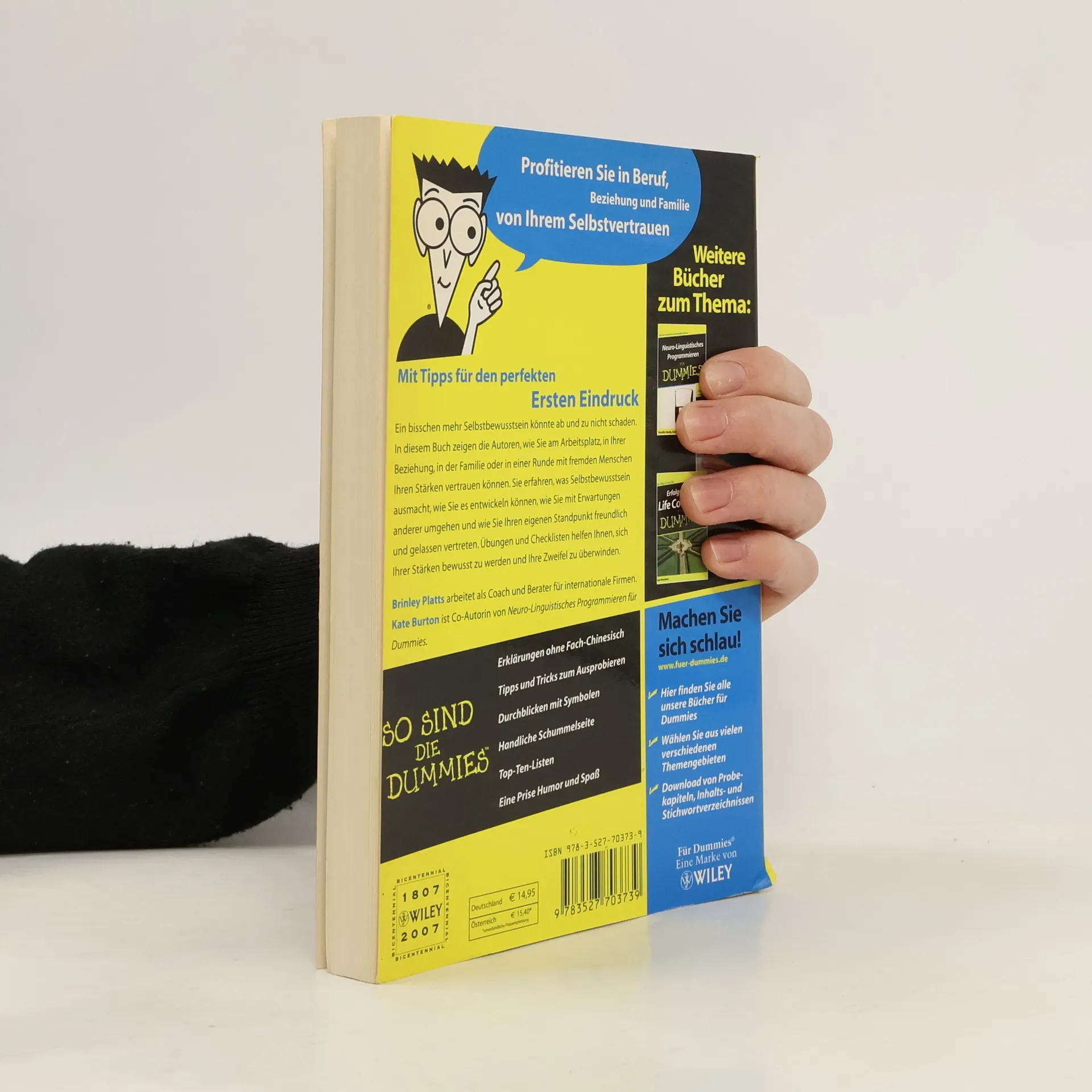 Ein bisschen mehr Selbstbewusstsein könnte ab und zu nicht schaden. In diesem Buch zeigen Ihnen Brinley Platts und Kate Burton, die Co-Autorin von „Neuro-Linguistisches Programmieren für Dummies“, wie Sie am Arbeitsplatz, in einer Beziehung oder in einer Runde mit fremden Menschen Ihren Stärken vertrauen können. Sie erfahren, was Selbstbewusstsein ausmacht, und wie Sie es entwickeln können, wie Sie mit Erwartungen anderer umgehen und wie Sie Ihren eigenen Standpunkt freundlich und gelassen vertreten. Übungen und Checklisten helfen Ihnen, sich Ihrer Stärken bewusst zu werden und Ihre Zweifel zu überwinden.
