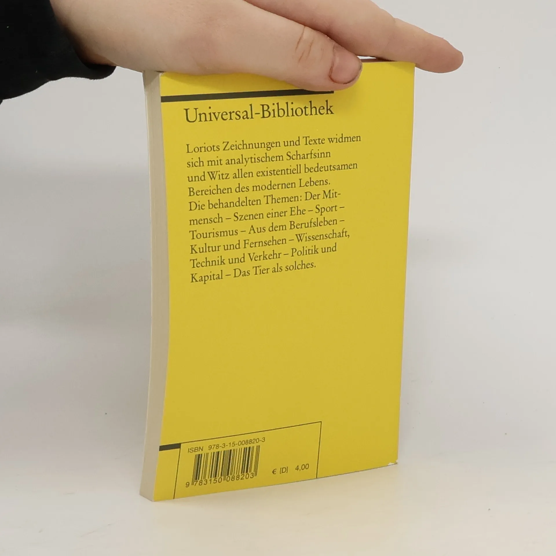 Loriots Zeichnungen und Texte widmen sich mit analytischem Scharfsinn und Witz allen existentiell bedeutsamen Bereichen des modernen Lebens. Die behandelten Themen: Der Mitmensch - Szenen einer Ehe - Sport - Tourismus - Aus dem Berufsleben - Kultur und Fernsehen - Wissenschaft, Technik und Verkehr - Politik und Kapital - Das Tier als solches.