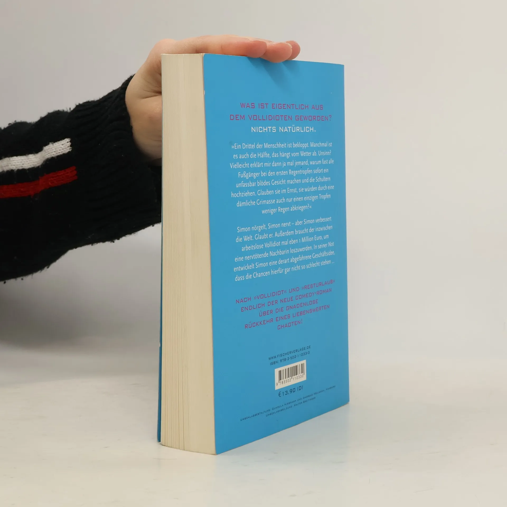 'Ein Drittel der Menschheit ist bekloppt. Manchmal ist es auch die Hälfte, das hängt vom Wetter ab. Unsinn? Vielleicht erklärt mir dann ja mal jemand, warum fast alle Fußgänger bei den ersten Regentropfen sofort ein unfassbar blödes Gesicht machen und die Schultern hochziehen. Glauben sie im Ernst, sie würden durch eine dämliche Grimasse auch nur einen einzigen Tropfen weniger Regen abkriegen? Das ist eine rhetorische Frage mit einer sehr, sehr traurigen Antwort: Sie glauben es.' Simon nörgelt, Simon nervt – aber Simon verbessert die Welt. Glaubt er. Außerdem braucht der inzwischen arbeitslose Vollidiot mal eben 1 Million Euro, um eine nervtötende Nachbarin loszuwerden. In seiner Not entwickelt Simon eine derart abgefahrene Geschäftsidee, dass die Chancen hierfür gar nicht so schlecht stehen. Nach ›Vollidiot‹ und ›Resturlaub‹ endlich der neue Comedy-Roman über die gnadenlose Rückkehr eines liebenswerten Chaoten!