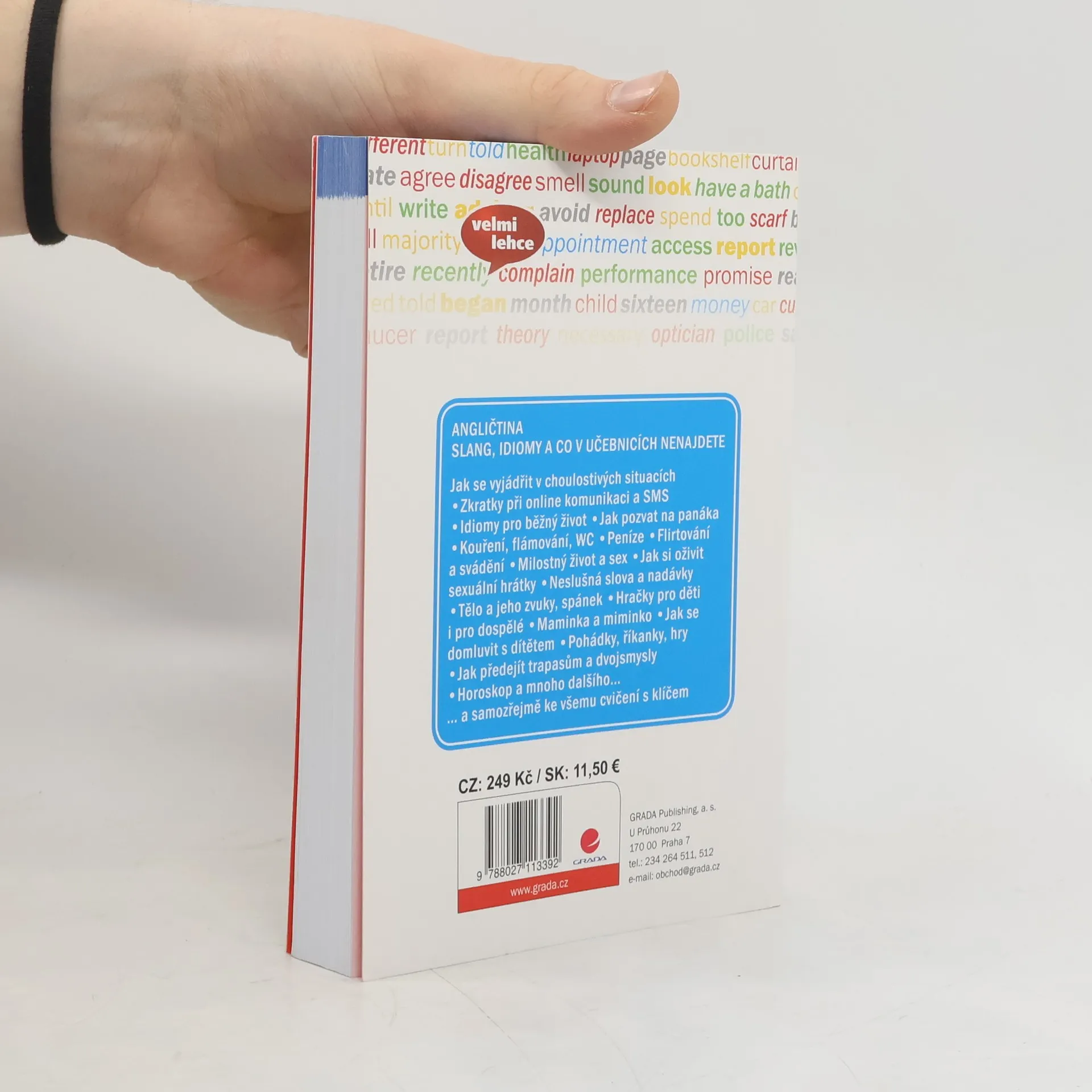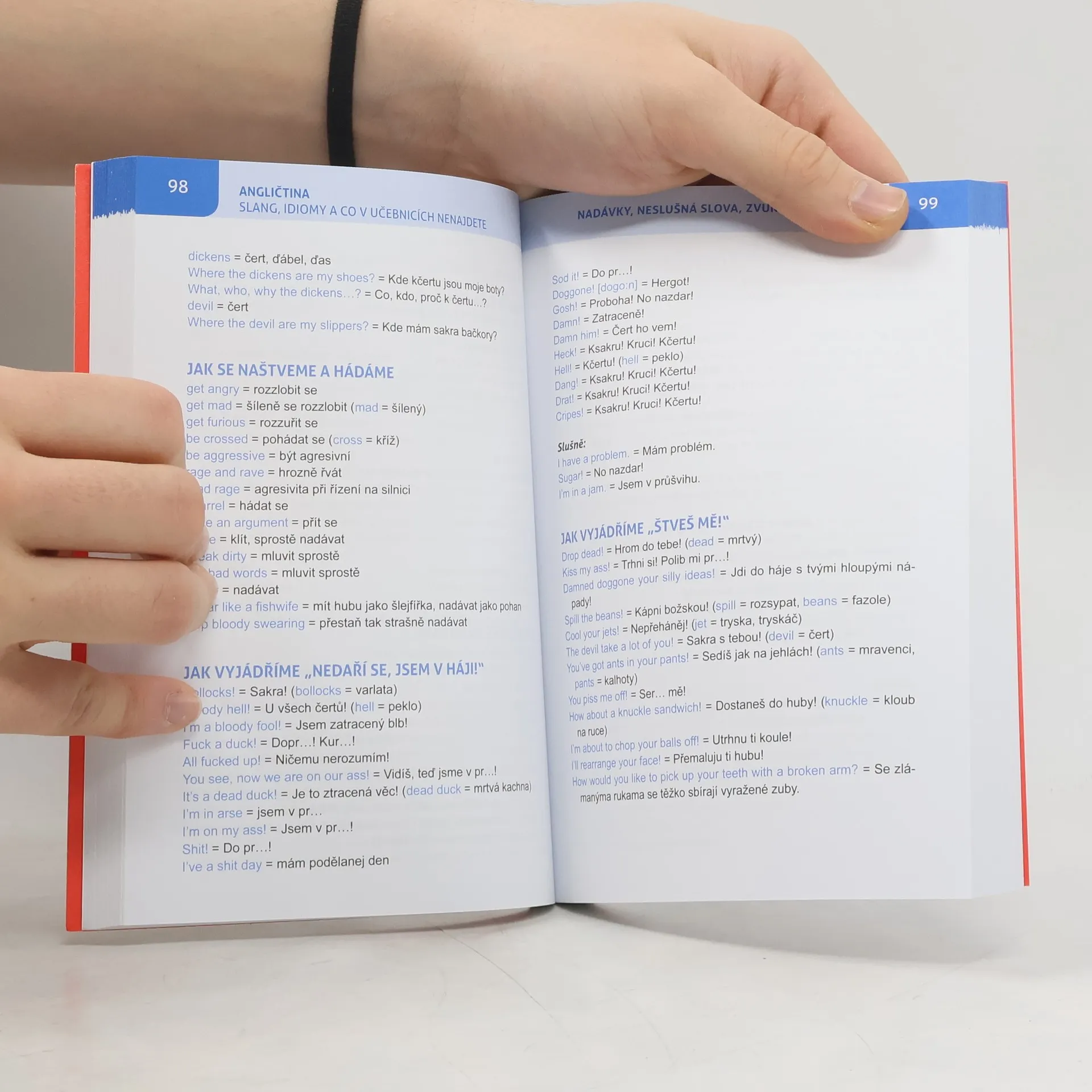 Jak se vyjádřit v choulostivých situacích, jak rozumět výrazům, které se stydíme říct nahlas, zkratky při online komunikaci a SMS, idiomy pro běžný život, jak pozvat na panáka, kouření, flámování, WC, peníze, flirtování a svádění, milostný život a sex, jak si oživit sexuální hrátky, neslušná slova a nadávky, tělo a jeho zvuky, spánek, hračky pro děti i pro dospělé, maminka a miminko, jak se domluvit s dítětem, pohádky, říkanky, hry, jak předejít trapasům a dvojsmysly, hroskop, vlastnosti a mnoho dalšího.... a samozřejmě ke všemu cvičení s klíčem.