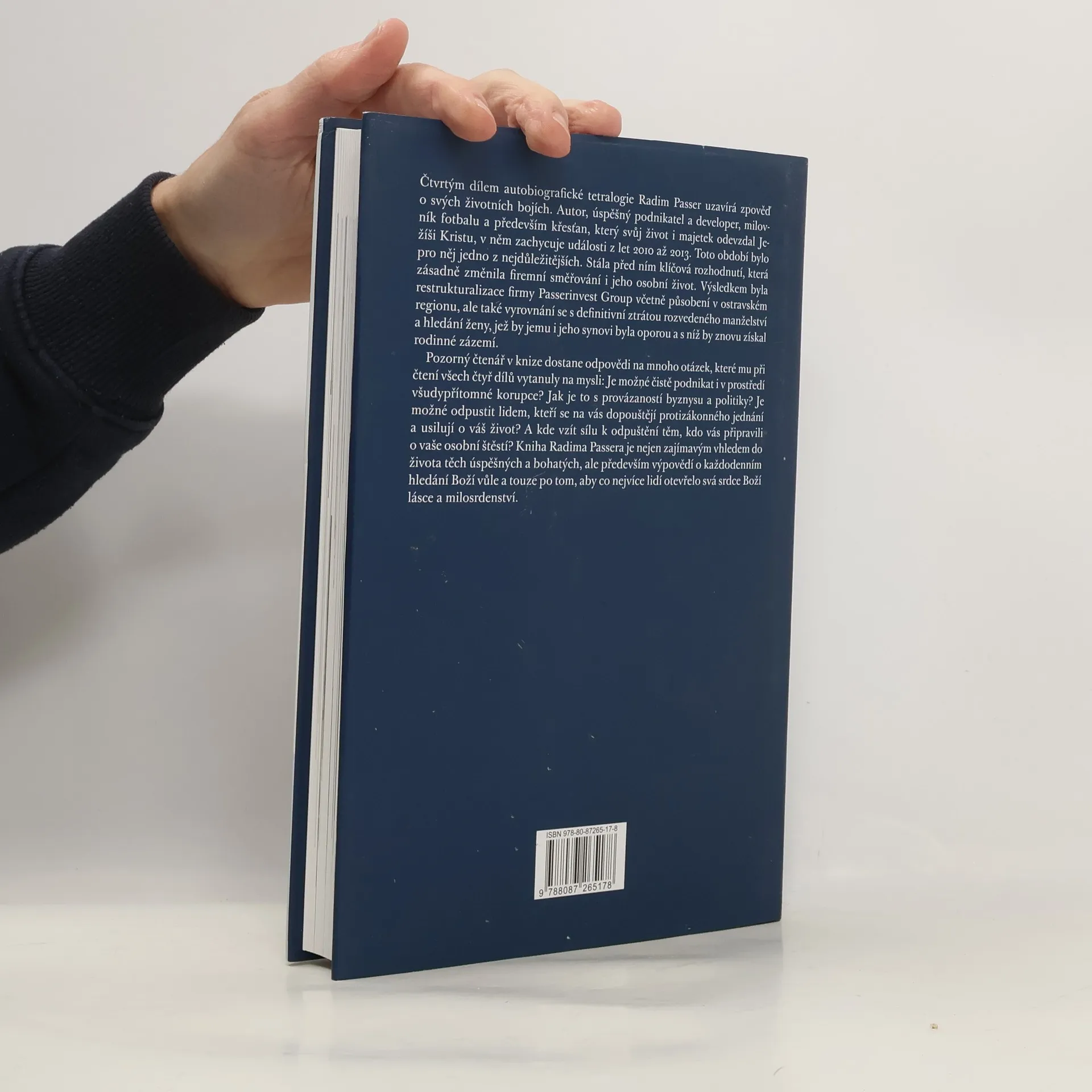 Čtvrtým dílem autobiografické tetralogie Radim Passer uzavírá zpověď o svých životních bojích. Autor, úspěšný podnikatel a developer, milovník fotbalu a především křesťan, který svůj život i majetek odevzdal Ježíši Kristu, v něm zachycuje události z let 2010 až 2013. Toto období bylo pro něj jedno z nejdůležitějších. Stála před ním klíčová rozhodnutí, která zásadně změnila firemní směrování i jeho osobní život. Výsledkem byla restrukturalizace firmy Passerinvest Group včetně působení v ostravském regionu, ale také vyrovnání se s definitivní ztrátou rozvedeného manželství a hledání ženy, jež by jemu i jeho synovi byla oporou a s níž by znovu získal rodinné zázemí. Pozorný čtenář v knize dostane odpovědi na mnoho otázek, které mu při čtení všech čtyř dílu vytanuly na mysli: Je možné čistě podnikat i v prostředí všudypřítomné korupce? Jak je to s provázaností byznysu a politiky? Je možné odpustit lidem, kteří se na vás dopouštějí protizákonného jednání a usilují o váš život? A kde vzít sílu k odpuštění těm, kdo vás připravili o vaše osobní štěstí? Kniha Radima Passera je nejen zajímavým vhledem do života těch úspěšných a bohatých, ale především výpovědí o každodenním hledání Boží vůle a touze po tom, aby co nejvíce lidí otevřelo svá srdce Boží lásce a milosrdenství.