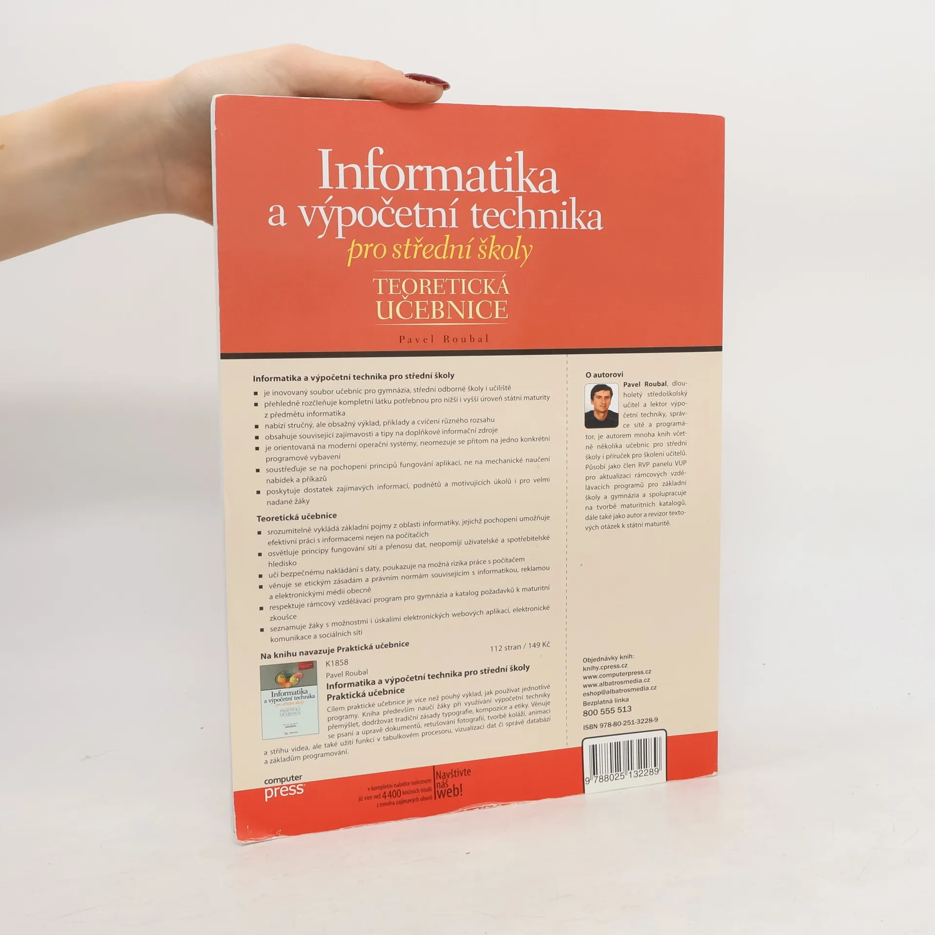Informatika a výpočetní technika pro střední školy je nový moderní soubor učebnic pro gymnázia, střední odborné školy i učiliště nabízí stručný, ale obsažný výklad, příklady a cvičení různého rozsahu obsahuje související zajímavosti a tipy na doplňkové informační zdroje soustřeďuje se na pochopení principů fungování aplikací, ne na mechanické naučení nabídek a příkazů rozdělením do více dílů lépe umožňuje vlastní výběr probíraných témat Teoretická učebnice srozumitelně vykládá základní pojmy z oblasti informatiky, jejichž pochopení umožňuje efektivní práci s informacemi (nejen) na počítačích blíže se věnuje popisu softwarového i hardwarového vybavení a sítí, neopomíjí uživatelské a spotřebitelské hledisko učí bezpečnému nakládání s daty, poukazuje na možná rizika práce s počítačem stručně seznamuje s principy programování a práce s databázemi respektuje rámcový vzdělávací program pro gymnázia a katalog požadavků k maturitní zkoušce Další díly Praktická učebnice 1 (základy práce s PC, Internet, text a tabulky) Praktická učebnice 2 (grafika a fotografie, tvorba prezentací a webových stránek) Praktická učebnice 3 (práce s databázemi) Praktická učebnice 4 (algoritmizace a programování) Metodická příručka pro praktické učebnice 1 a 2 Metodická příručka pro praktické učebnice 3 a 4 O autorovi: Pavel Roubal je zkušený autor mnoha knih včetně několika učebnic pro střední školy, ale také manuálů pro školení učitelů projektu SIPVZ (úrovně Z a modulu Grafika a digitální fotografie).