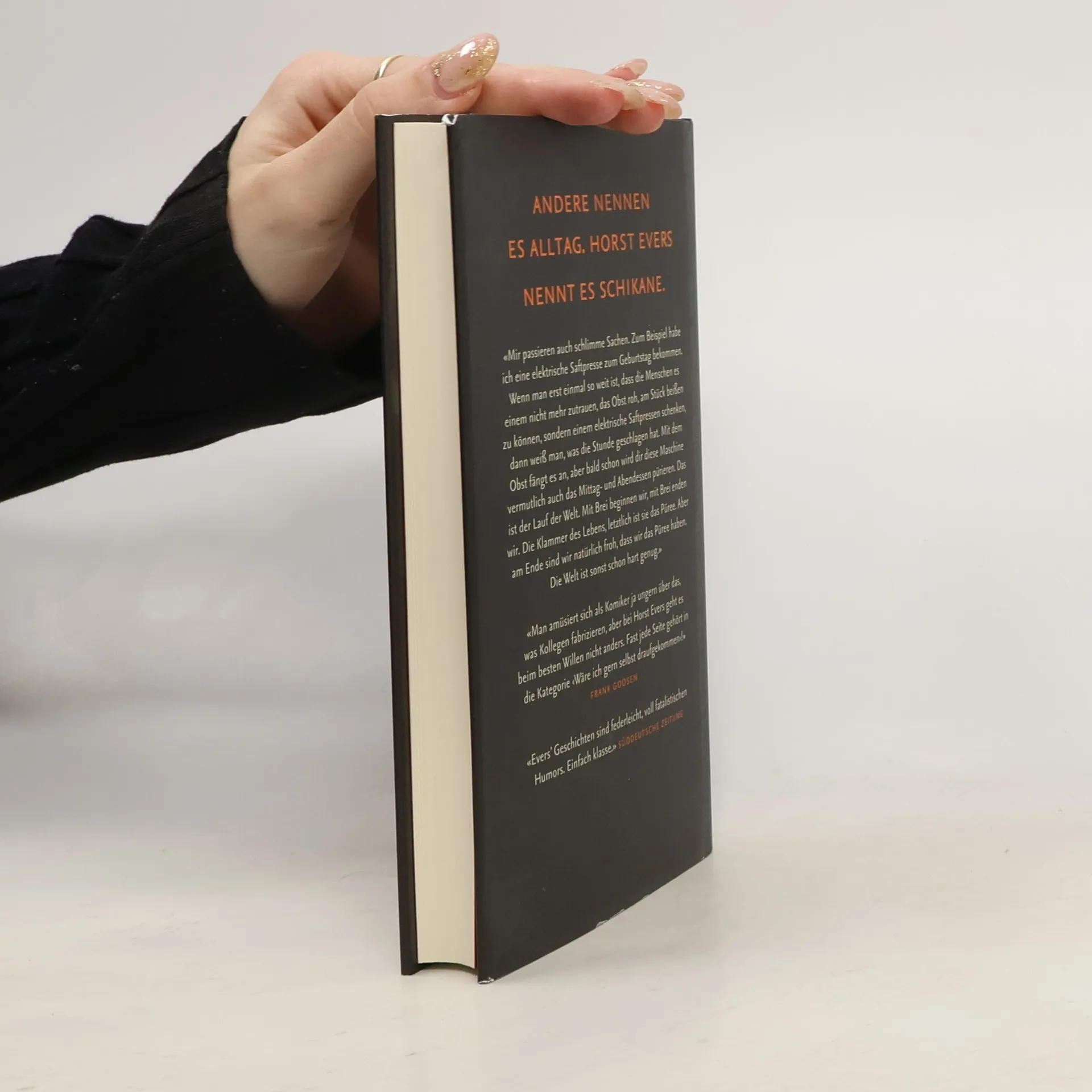 Andere nennen es Alltag. Horst Evers nennt es Schikane.«Mir passieren auch schlimme Sachen. Zum Beispiel habe ich eine elektrische Saftpresse zum Geburtstag bekommen. Wenn man erst einmal so weit ist, dass die Menschen es einem nicht mehr zutrauen, das Obst roh, am Stück beißen zu können, sondern einem elektrische Saftpressen schenken, dann weiß man, was die Stunde geschlagen hat. Mit dem Obst fängt es an, aber bald schon wird dir diese Maschine vermutlich auch das Mittag- und Abendessen pürieren. Das ist der Lauf der Welt. Mit Brei beginnen wir, mit Brei enden wir. Die Klammer des Lebens, letztlich ist sie das Püree. Aber am Ende sind wir natürlich froh, dass wir das Püree haben. Die Welt ist sonst schon hart genug.»«Man amüsiert sich als Komiker ja ungern über das, was Kollegen fabrizieren, aber bei Horst Evers geht es beim besten Willen nicht anders. Fast jede Seite gehört in die Kategorie ‹Wäre ich gern selbst draufgekommen›!» Frank Goosen«Evers’ Geschichten sind federleicht, voll fatalistischen Humors. Einfach klasse.» Süddeutsche Zeitung