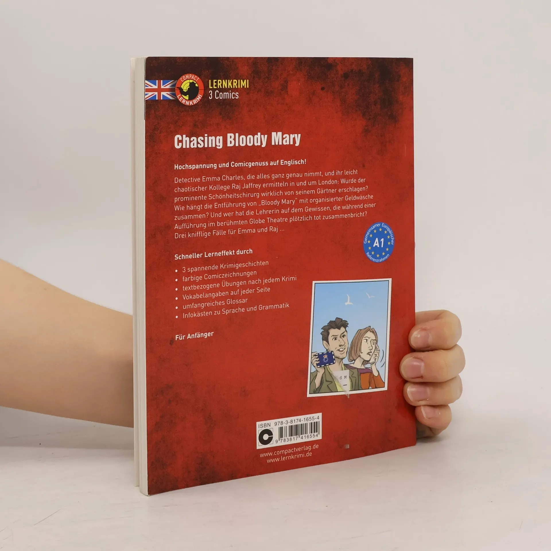 Spannung fürs Auge mit den Compact Lernkrimi Comics! Möchten Sie spannend Sprachen lernen und gleichzeitig sprachliche Hürden meistern? Das erfolgreiche Krimi-Lernkonzept des Circon Verlags gibt es jetzt als Comic! Mit der Kombination aus Grafik und optimiertem Sprachtraining verbessern Sie Ihre Sprachfähigkeiten intuitiv. In „Chasing Bloody Mary“ ermitteln Detective Emma Charles und ihr chaotischer Kollege Raj Jaffrey in London. Sie stellen sich Fragen wie: Hat der Gärtner den Schönheitschirurgen James Ashton erschlagen? Wie hängt der Mord mit dem Pferderennen in Ascot zusammen? Was hat die Entführung der „Bloody Mary“ mit Geldwäsche zu tun? Und warum bricht während einer „Hamlet“-Aufführung im Globe Theatre eine Zuschauerin tot zusammen? Ihr Englisch-Lerncomic bietet drei spannende Krimigeschichten, die es Ihnen ermöglichen, in die Rollen der Ermittler zu schlüpfen und Ihre Englischkenntnisse zu verbessern. Farbige Comiczeichnungen unterstützen den Lerneffekt, während textbezogene Übungen die Merkfähigkeit steigern. Vokabelangaben auf jeder Seite sind griffbereit, und ein umfassendes Glossar am Ende des Buches erleichtert das Nachschlagen. Infokästen zu Sprache und Grammatik ergänzen die Geschichten und fördern das Lernen. Die Compact Kurzkrimis bieten positive Leseerfahrungen auf jedem Sprachniveau und sind in mehreren Sprachen verfügbar. Sie sind ideal für den Einsatz in Schulen, Universitäten oder für Selbstlerner,