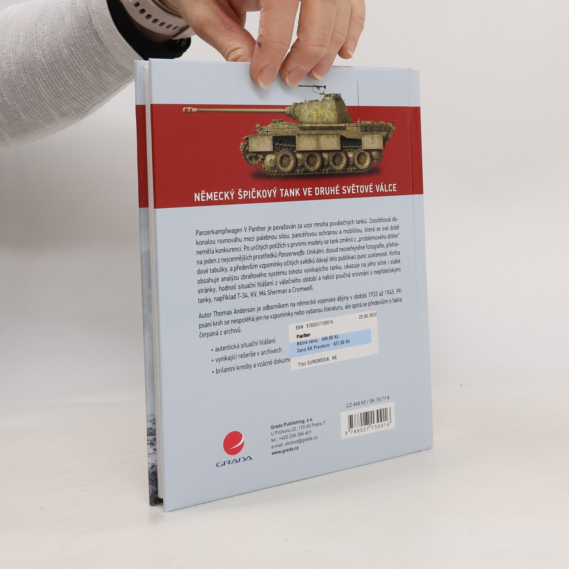 Historie, technika, situační hlášení Panzerkampfwagen V Panther je považován za vzor mnoha poválečných tanků. Zosobňoval dokonalou rovnováhu mezi palebnou silou, pancéřovou ochranou a mobilitou, která ve své době neměla konkurenci. Po určitých potížích s prvními modely se tank změnil z „problémového dítěte“ na jeden z nejcennějších prostředků Panzerwaffe. Unikátní, dosud nezveřejněné fotografie, přehledové tabulky, a především vzpomínky očitých svědků dávají této publikaci punc ucelenosti. Kniha obsahuje analýzu zbraňového systému tohoto vynikajícího tanku, ukazuje na jeho silné i slabé stránky, hodnotí situační hlášení z válečného období a nabízí poučná srovnání s nepřátelskými tanky, například T-34, KV, M4 Sherman a Cromwell. Autor Thomas Anderson je odborníkem na německé vojenské dějiny v období 1933 až 1945. Při psaní knih se nespoléhá jen na vzpomínky nebo vydanou literaturu, ale opírá se především o fakta čerpaná z archivů.
