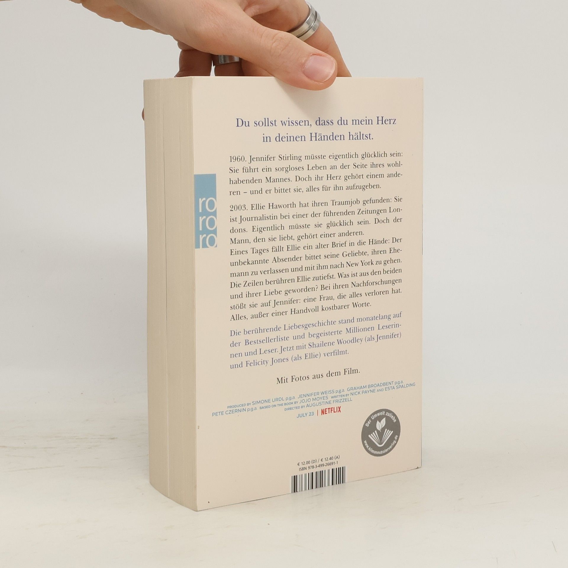 Eine dramatische Liebesgeschichte aus der Feder von Bestsellerautorin Jojo Moyes über die Leidenschaft, die Worte entfachen können, und die Kraft einer Liebe, die Jahrzehnte und Schicksalsschläge überdauert. Prominent verfilmt - mit Shailene Woodley, Felicity Jones und Callum Turner.  1960. Jennifer Stirling müsste eigentlich glücklich sein: Sie führt ein sorgloses Leben an der Seite ihres wohlhabenden Mannes. Doch ihr Herz gehört einem anderen – und er bittet sie, alles für ihn aufzugeben. 2003. Ellie Haworth hat ihren Traumjob gefunden: Sie ist Journalistin bei einer der führenden Zeitungen Londons. Eigentlich müsste sie glücklich sein. Doch der Mann, den sie liebt, gehört einer anderen. Eines Tages fällt Ellie ein jahrzehntealter Liebesbrief in die Hände: In leidenschaftlichen Worten bittet der unbekannte Absender seine Geliebte, ihren Ehemann zu verlassen und mit ihm nach New York zu gehen. Als Ellie diese Zeilen liest, ist sie erschüttert. Was ist aus den beiden und ihrer Liebe geworden? Sie stellt Nachforschungen an und stößt auf Jennifer: eine Frau, die alles verloren hat. Alles, außer einer Handvoll kostbarer Worte. Mit Fotos aus dem Film im Innenteil.