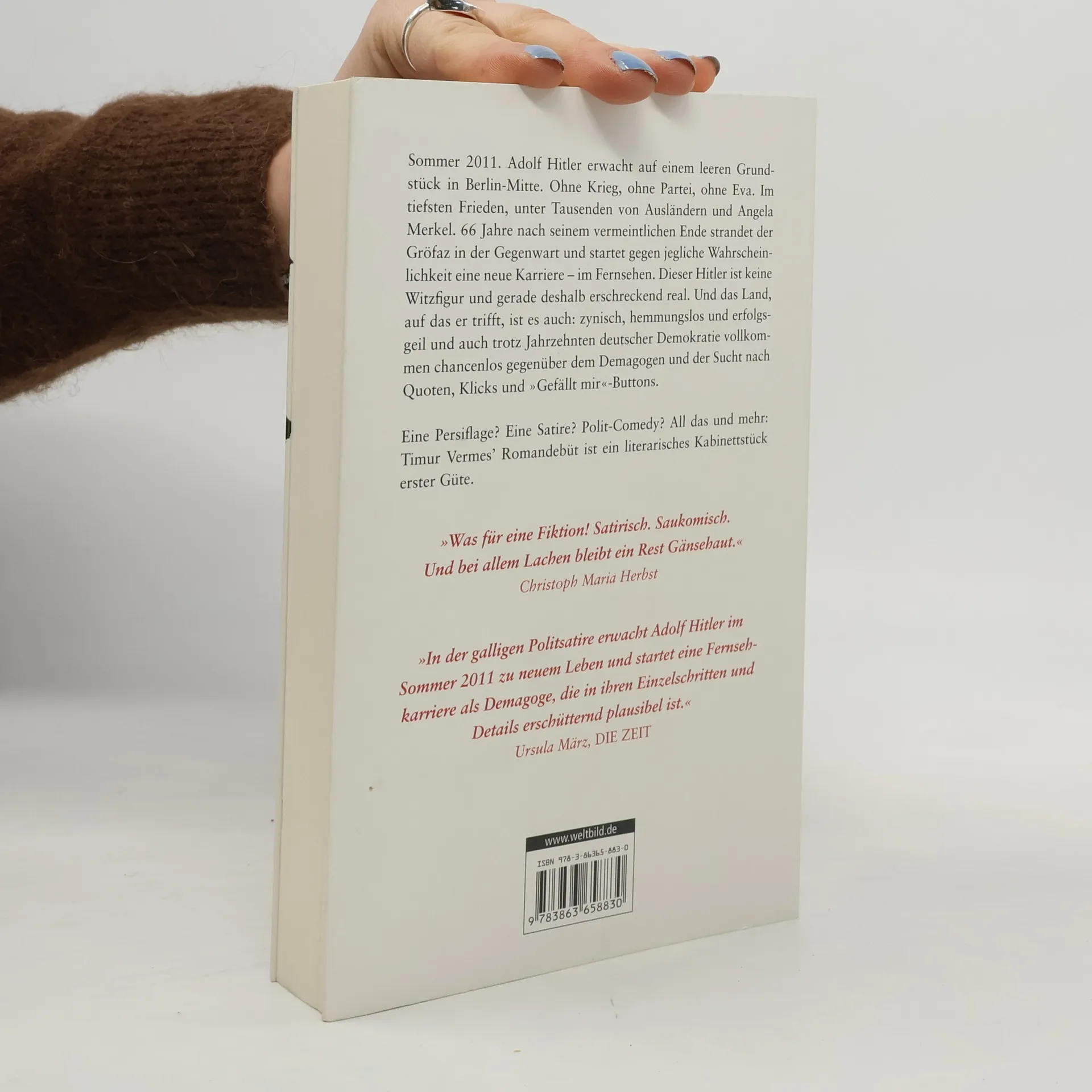 Alle Informationen zu „Er ist wieder da“ Produktbeschreibung Ein alter Bekannter betritt erneut die politische Weltbühne Sommer 2011. Adolf Hitler erwacht auf einem leeren Grundstück in Berlin-Mitte. Ohne Krieg, ohne Partei, ohne Eva. Im tiefsten Frieden, unter Tausenden von Ausländern und Angela Merkel. 66 Jahre nach seinem vermeintlichen Ende strandet der Gröfaz in der Gegenwart und startet gegen jegliche Wahrscheinlichkeit eine neue Karriere – im Fernsehen. Dieser Hitler ist keine Witzfigur und gerade deshalb erschreckend real. Und das Land, auf das er trifft, ist es auch: zynisch, hemmungslos und erfolgsgeil und auch trotz Jahrzehnten deutscher Demokratie vollkommen chancenlos gegenüber dem Demagogen und der Sucht nach Quoten, Klicks und \"Gefällt mir\"-Buttons. Eine Persiflage? Eine Satire? Polit-Comedy? All das und mehr: Timur Vermes' Romandebüt ist ein literarisches Kabinettstück erster Güte.