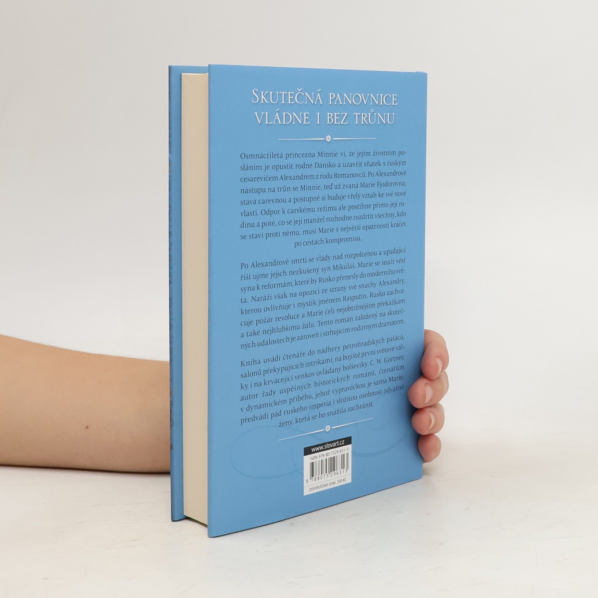 Román o Marii Fjodorovně, matce posledního cara Osmnáctiletá princezna Minnie ví, že jejím životním posláním je opustit rodné Dánsko a uzavřít sňatek s ruským carevičem Alexandrem z rodu Romanovců. Po Alexandrově nástupu na trůn se Minnie, teď už zvaná Maria Fjodorovna, stává carevnou a postupně si buduje vřelý vztah ke své nové vlasti. Odpor k carskému režimu ale postihne přímo její rodinu, a poté co se její manžel rozhodne rozdrtit všechny, kdo se staví proti němu, musí Maria s největší opatrností kráčet po cestách kompromisu. Po Alexandrově smrti se jejich nezkušený syn Mikuláš ujme vlády nad hluboce rozdělenou a upadající říší. Maria se snaží vést syna k reformám, které by Rusko přenesly do moderního světa. Naráží však na opozici ze strany své snachy Alexandry, kterou ovlivňuje i mystik jménem Rasputin. Rusko zachvacuje požár revoluce a Maria čelí nejobtížnějším překážkám a také nejhlubšímu žalu. Román založený na skutečných dějinných událostech uvádí čtenáře do nádhery petrohradských paláců, salonů překypujících intrikami, na bojiště první světové války i na krvácející venkov ovládaný bolševiky. C. W. Gortner, autor řady úspěšných historických románů, čtenářům v dynamickém příběhu, jehož vypravěčkou je sama Maria, předvádí pád ruského impéria i složitou osobnost odvážné ženy, která se ho snažila zachránit.