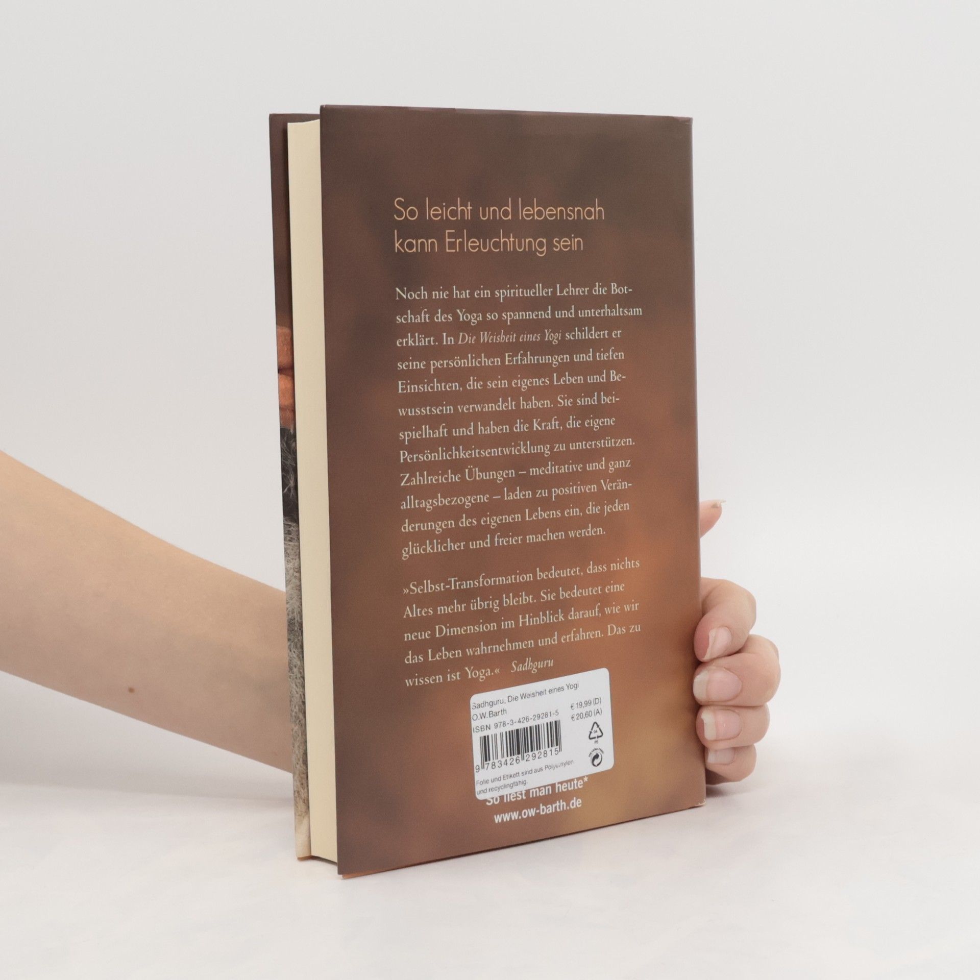 Noch nie hat ein spiritueller Lehrer die Botschaft des Yoga so spannend und unterhaltsam erklärt. Sadhguru ist für unzählige Menschen ein leuchtendes Vorbild. In Die Weisheit eines Yogi schildert er seine persönlichen Erfahrungen und tiefen Einsichten, die sein eigenes Leben und Bewusstsein verwandelt haben. Sie sind beispielhaft und haben die Kraft, die eigene Persönlichkeitsentwicklung zu unterstützen. Zahlreiche Übungen laden zu positiven Veränderungen des eigenen Lebens ein, die jeden glücklicher und freier machen werden. Yoga ist ein Mittel, die vitalen Energien so zu nutzen und zu aktivieren, dass Körper und Geist mit ihrer optimalen Kapazität funktionieren. Er ist ein Instrument, um innere Situationen genauso zu erschaffen, wie du sie willst. Du wirst somit zum Architekten deines inneren und äußeren Lebens. Diesen Weg erklärt Yoga-Meister Sadhguru mit leicht umsetzbaren Übungen, klaren Erläuterungen der Grundgedanken des Yoga und spannenden Berichten aus seiner persönlichen Geschichte und der anderer bedeutender Yogis. Guru bedeutet wörtlich: „der die Dunkelheit zerstört“. Ein Sadhguru ist jemand, der die universelle Wahrheit (Sat) verkörpert. Es ist jemand, der die Tür für dich öffnet, eine Tür zu echter Selbst-Transformation.