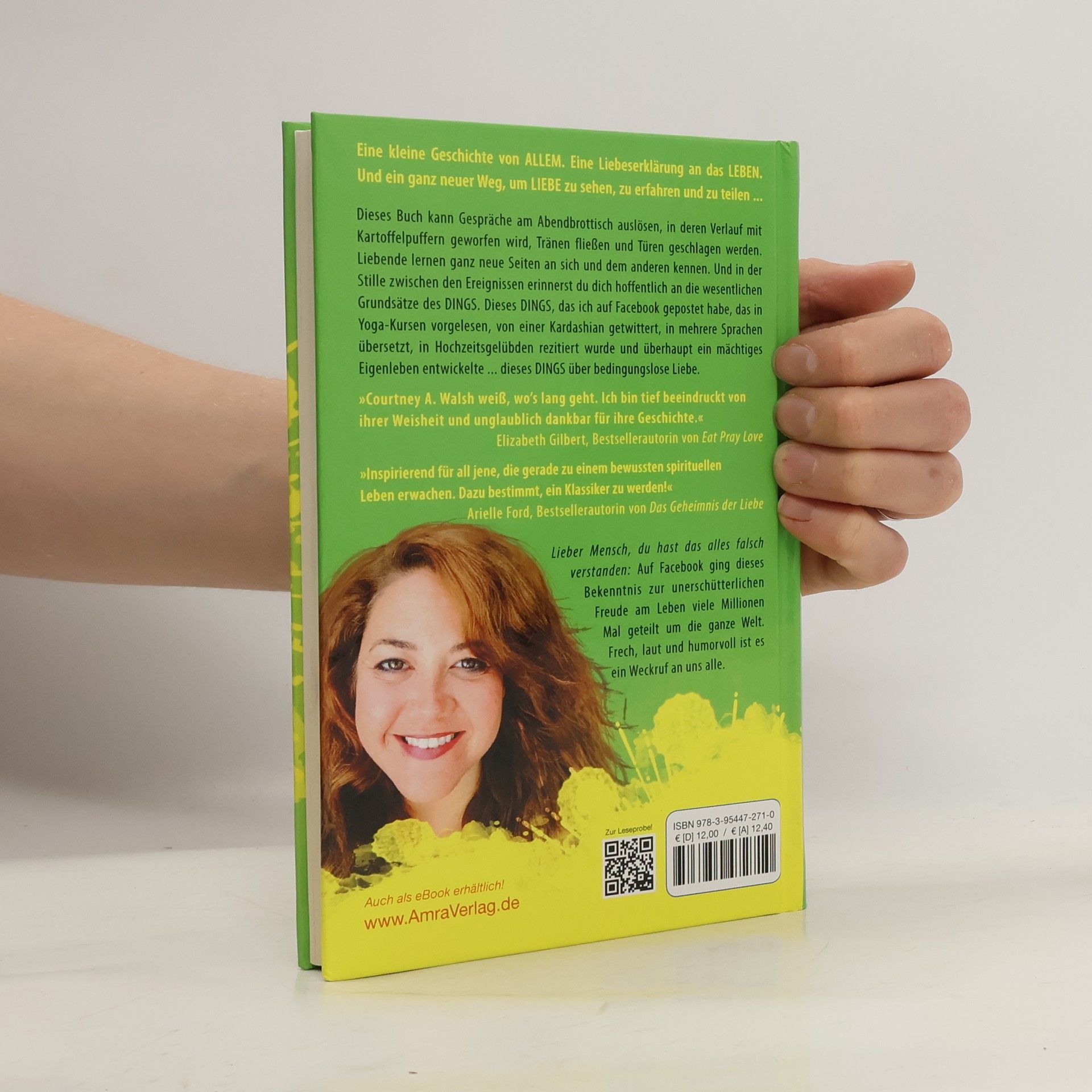 »Courtney A. Walsh weiß, wo’s lang geht. Ich bin tief beeindruckt von ihrer Weisheit und unglaublich dankbar für ihre Geschichte.« – Elizabeth Gilbert, Autorin von EAT PRAY LOVE. Eine kleine Geschichte von ALLEM. Eine Liebeserklärung an das LEBEN und ein neuer Weg, um LIEBE zu sehen und zu teilen. Auf Facebook wurde das Bekenntnis zur unerschütterlichen Freude am Leben millionenfach geteilt. Es ist ein frecher, lauter und humorvoller Weckruf für uns alle! »Lieber Mensch, du hast das alles falsch verstanden. Du bist nicht hier, um bedingungslose Liebe zu meistern. Diese Liebe kommt von dort, wo du herkommst, und wohin du zurückkehrst. Du bist hier, um persönliche Liebe zu lernen – universelle, chaotische, verrückte und kaputte Liebe. Du bist nicht hier, um perfekt zu werden; das bist du schon. Du bist hier, um prachtvoll menschlich zu sein, fehlerhaft und fabelhaft, und um dich daran zu erinnern. Liebe braucht keine Adjektive, sie muss nicht verändert oder perfekt sein. Sie bittet dich nur, präsent zu sein und dein Bestes zu geben. Du sollst alles fühlen, strahlen, lachen und weinen, verletzt sein und heilen, hinfallen und wieder aufstehen, leben und sterben als DU. Das ist genug. Das ist so viel.«