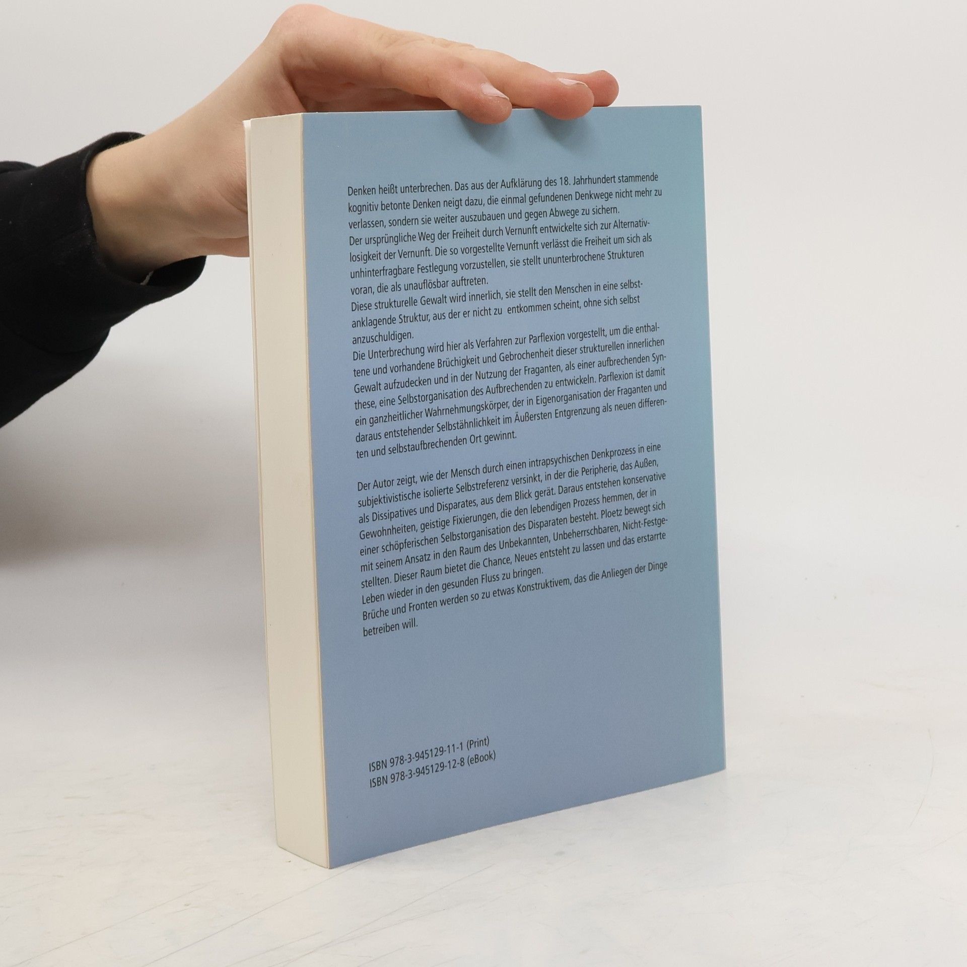 Denken heißt unterbrechen. Das kognitiv betonte Denken aus der Aufklärung des 18. Jahrhunderts tendiert dazu, einmal gefundene Denkwege nicht zu verlassen, sondern sie weiter auszubauen und gegen Abwege zu sichern. Die ursprüngliche Freiheit durch Vernunft entwickelte sich zur Alternativlosigkeit der Vernunft, die sich als unhinterfragbare Festlegung präsentiert und ununterbrochene Strukturen etabliert, die als unauflösbar erscheinen. Diese strukturelle Gewalt wird innerlich und führt den Menschen in eine selbstanklagende Struktur, aus der er ohne Selbstbeschuldigung nicht entkommen kann. Die Unterbrechung wird als Verfahren zur Parflexion vorgestellt, um die Brüchigkeit dieser innerlichen Gewalt aufzudecken und in der Nutzung der Fraganten eine Selbstorganisation des Aufbrechenden zu entwickeln. Parflexion fungiert als ganzheitlicher Wahrnehmungskörper, der durch Eigenorganisation der Fraganten Selbstähnlichkeit und Entgrenzung als neuen, differenzierten Ort gewinnt. Der Autor zeigt, wie der Mensch durch einen intrapsychischen Denkprozess in eine isolierte Selbstreferenz versinkt, wobei die Peripherie als Dissipatives und Disparates aus dem Blick gerät. Dies führt zu konservativen Gewohnheiten und geistigen Fixierungen, die den kreativen Prozess hemmen. Ploetz bewegt sich im Raum des Unbekannten und Unbeherrschbaren, wo die Chance besteht, Neues zu schaffen und das erstarrte Leben wieder in Fluss zu bringen. Brüche und Fronte