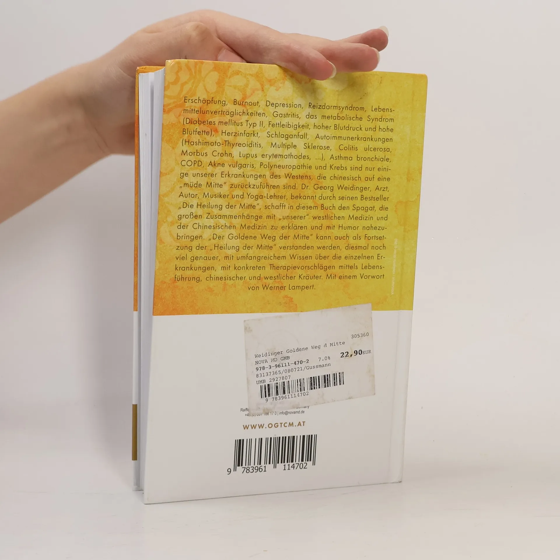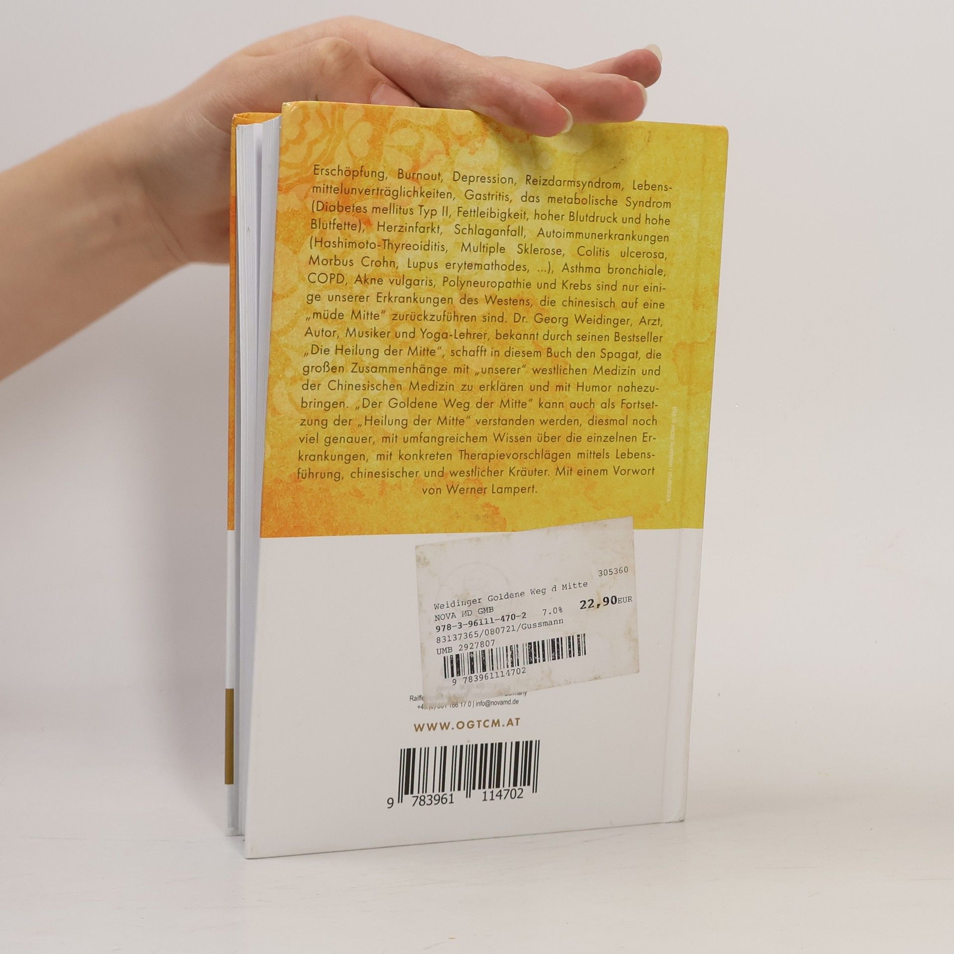 Erschöpfung, Burnout, Depression, Reizdarmsyndrom, Lebensmittelunverträglichkeiten, Gastritis, das metabolische Syndrom (Diabetes mellitus Typ II, Fettleibigkeit, hoher Blutdruck und hohe Blutfette), Herzinfarkt, Schlaganfall, Autoimmunerkrankungen (Hashimoto-Thyreoiditis, Multiple Sklerose, Colitis Ulcerosa, Morbus Crohn, Lupus Erytemathodes, ...), Asthma bronchiale, COPD, Akne vulgaris, Polyneuropathie und Krebs sind nur einige unserer Erkrankungen des Westens, die chinesisch auf eine „müde Mitte“ zurückzuführen sind. Dr. Georg Weidinger, Arzt, Autor, Musiker und Yoga-Lehrer, bekannt durch seinen Bestseller „Die Heilung der Mitte“, schafft in diesem Buch den Spagat, die großen Zusammenhänge mit „unserer“ westlichen Medizin und der Chinesischen Medizin zu erklären und mit Humor nahezubringen. „Der Goldene Weg der Mitte“ kann auch als Fortsetzung der „Heilung der Mitte“ verstanden werden, diesmal noch viel genauer, mit umfangreichem Wissen über die einzelnen Erkrankungen, mit konkreten Therapievorschlägen mittels Lebensführung, chinesischer und westlicher Kräuter. Mit einem Vorwort von Werner Lampert.