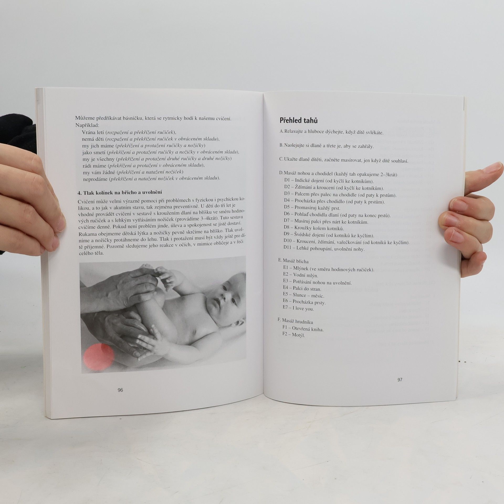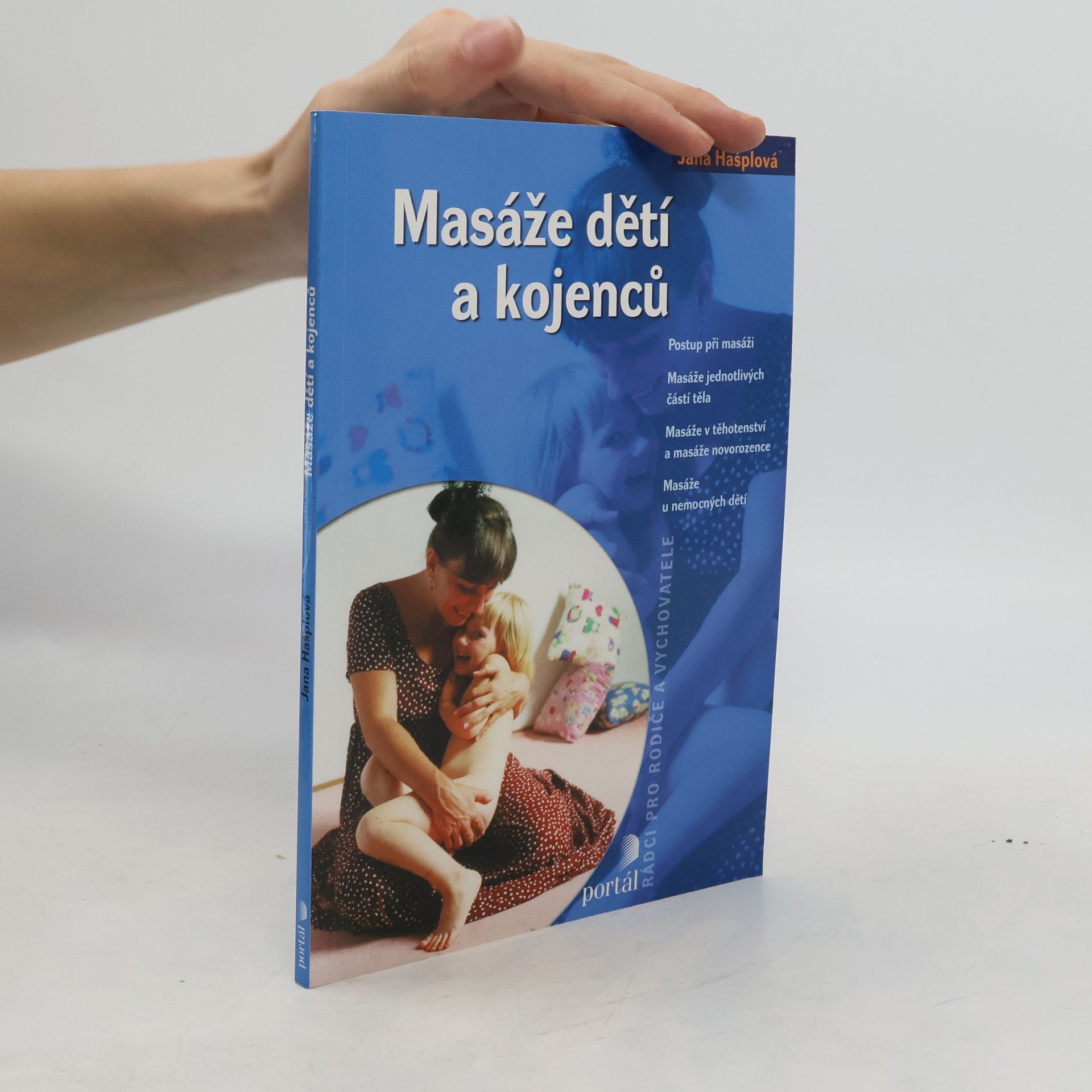 Postup při masáži, masáže jednotlivých částí těla, masáže v těhotenství a masáže novorozence, masáže u nemocných dětí. Názorné a přehledné uvedení do techniky masáží dětí a kojenců určené ať už pro výukové kurzy, pro profesionální pracovníky i pro samotné rodiče. Po teoretickém uvedení do problematiky masáží (účinnost masáží u zdravých i nemocných dětí, význam doteku jako součásti komunikace s dítětem, souvislosti a aroma- a muzikoterapií...) tvoří jádro knihy vlastní technika masáže, jež je ilustrována na cca. 75 fotografiích, které zájemcům pomohou osvojit si vlastní postup.