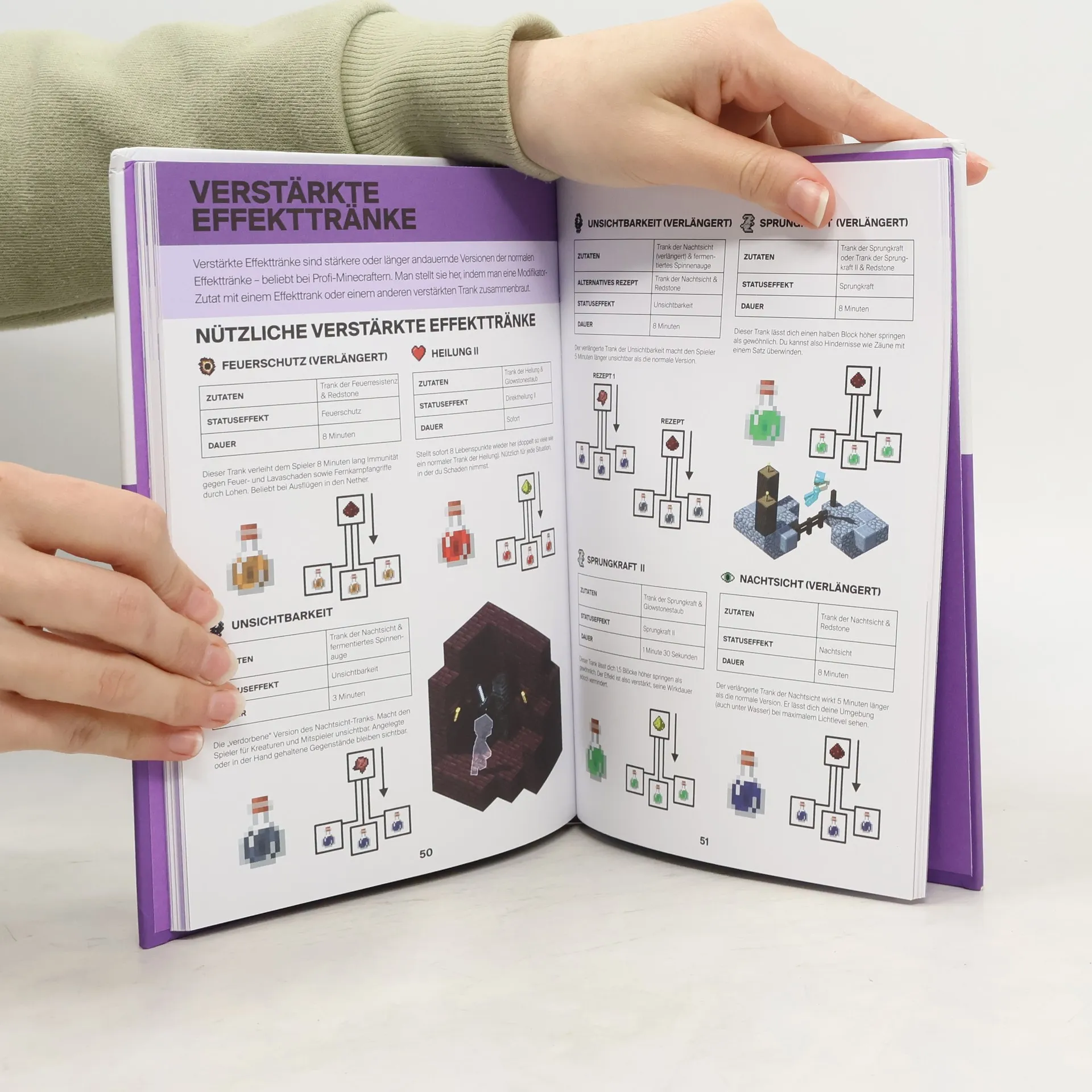 Wer in Minecraft überleben will, sollte auch etwas von Verzauberungen und Tränken verstehen. Ob du nun die ultimative Rüstung herstellen oder dich gegen fiese Gifte schützen willst - ohne die richtigen Zutaten und Rezepte kommst du nicht weit. Überall lauern arglistige Mitspieler und gefährliche Kreaturen, die dir das Leben schwer machen wollen. Gut, wenn man dann das offizielle Handbuch für Zauber und Tränke parat hat!